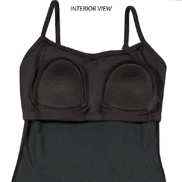 Este maillot de ballet color negro con sujetador incorporado combina la simplicidad clásica con una cobertura completa. Los tirantes ajustables para los hombros se convierten fácilmente de un estilo simple a una espalda cruzada con broches ultraseguros de color a juego, lo que brinda a los bailarines versatilidad y un ajuste personalizado. Un sujetador incorporado con copas ligeramente acolchadas y una banda de sostén integrada brinda soporte y cobertura adicionales (la banda del sostén se envuelve alrededor del torso y se engancha en la espalda).