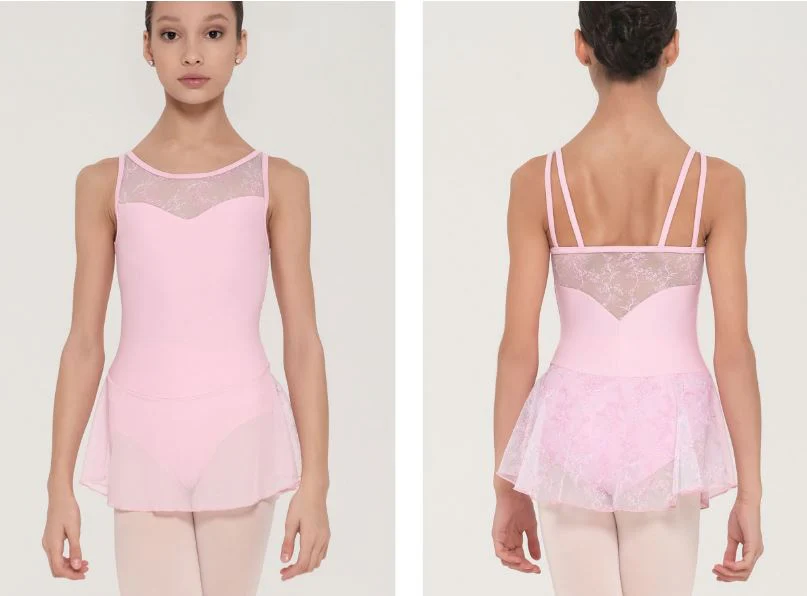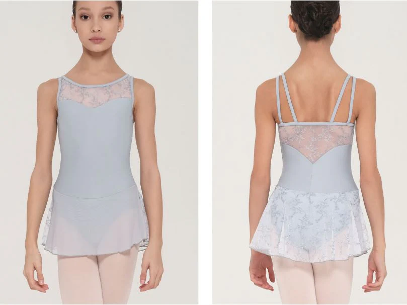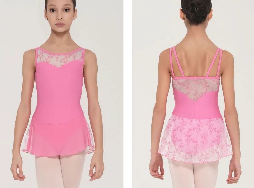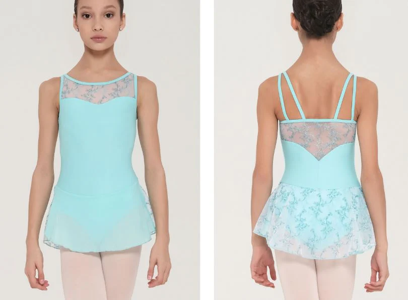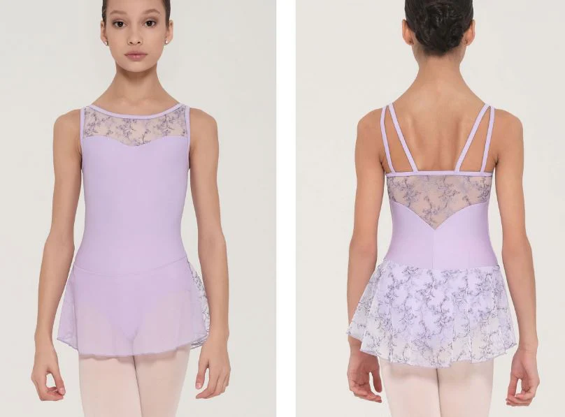 tus clases de baile. Tiene tirantes dobles que desembocan en paneles de tul transparente que se unen hasta el escote corazón en la parte delantera. La falda de dos tejidos está hecha de tul transparente delante y tul bordado transparente en la espalda. Este maillot está forrado en la parte superior delantera.