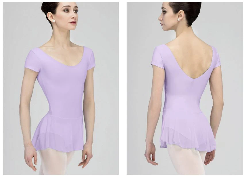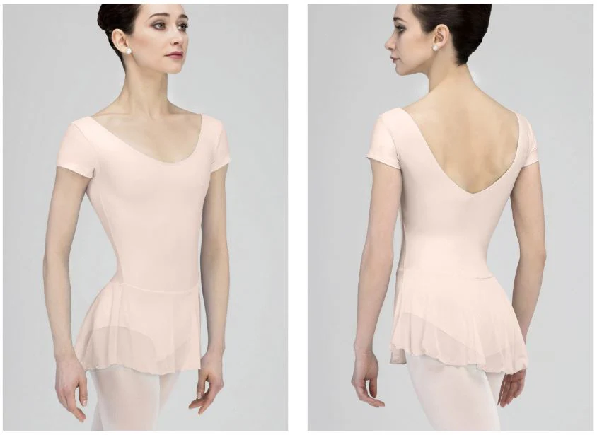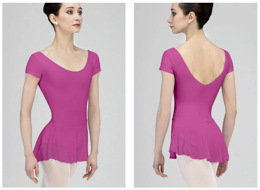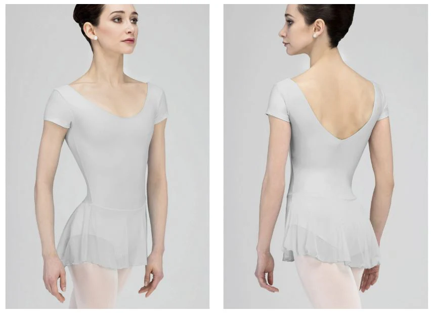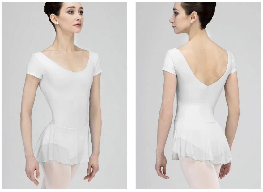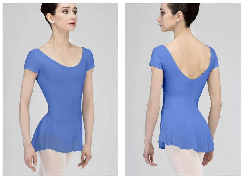 El modelo ARDESIA de Wear Moi es perfecto para clase de danza. Ideal para uniformes y para el día a día. Un básico que no puede faltar. De manga corta con el escote redondo y espalda media en forma de U/V. Lleva faldita de tulle incorporada del mismo color del maillot.