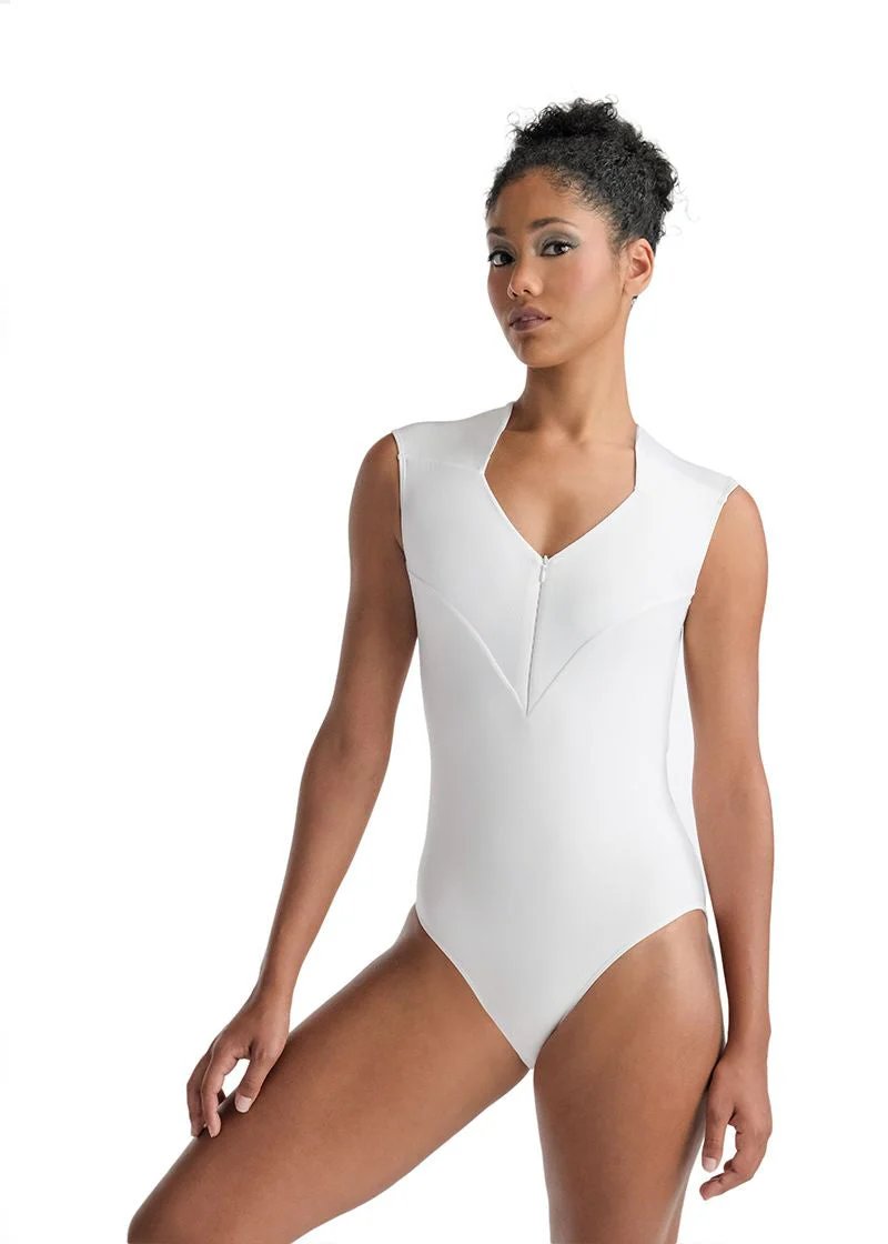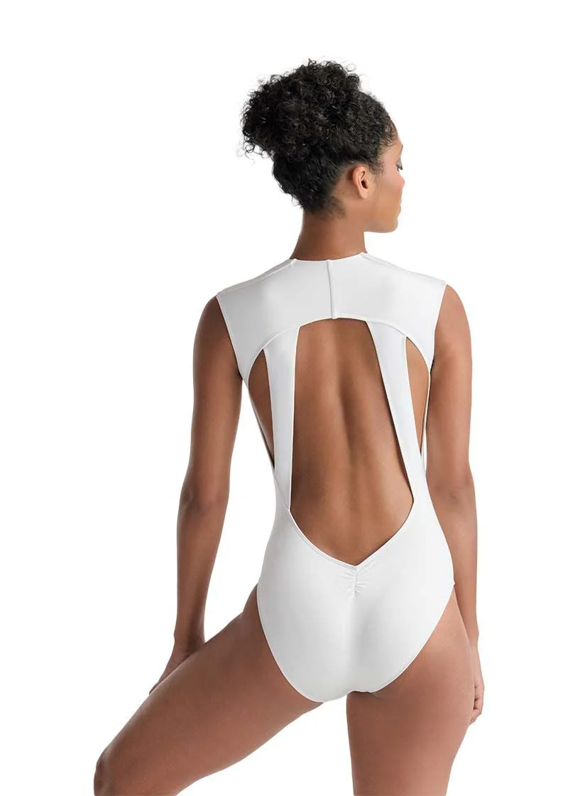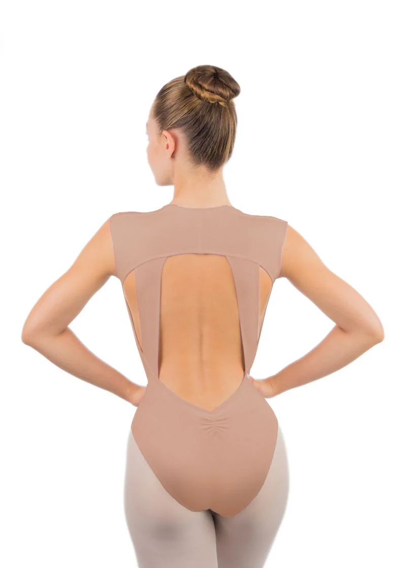 Maillot de danza. Sin mangas, con cremallera en la parte delantera. Con la espalda abierta. El modelo NARDÍA de Ballet Rosa es uno de los modelos que se incorporan a la colección Italienne 2023.