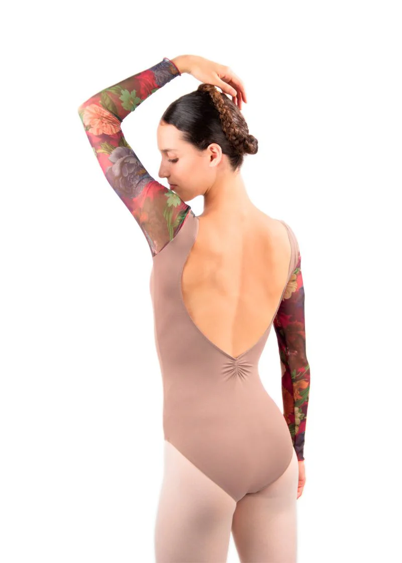 Elegante, con la espalda abierta en forma de pico. El modelo VALENTINA de Ballet Rosa está disponible en muchos colores y tallas. Es un modelo muy elegante de manga larga. Destaca tanto la parte delantera como las mangas con tejido mesh en estampado floral. Escote barco delantero.