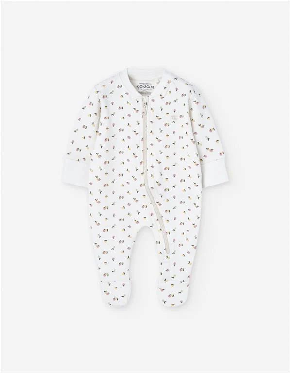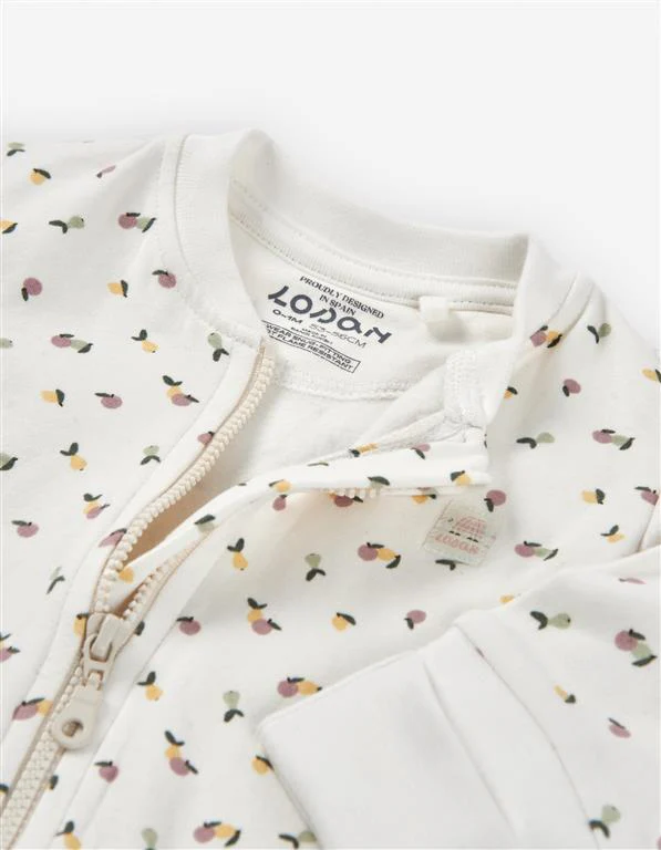 ¡Hermoso, practico y comodo mameluco de cierre de ziper! De cuello redondo, manga larga, cierre de ziper frontal que va desde el cuello hasta el tobillo para facilitar su puesta y cambio del pañal. Hermoso estampado de frutas en fondo blanco.
