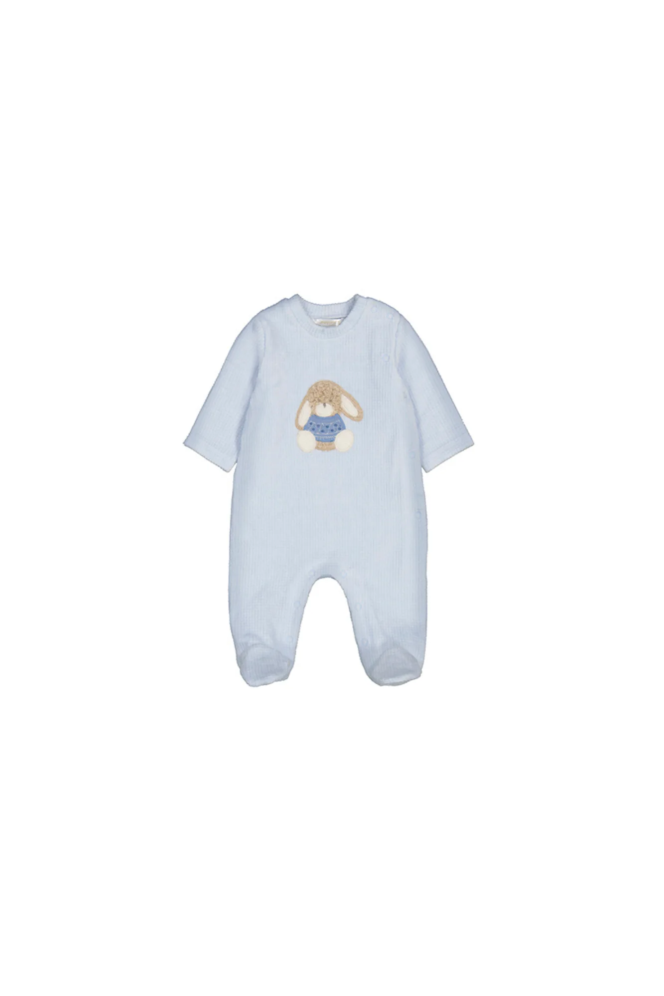 ¡Hermoso mameluco afelpado con dibujo de conejo bordado! Cuello redondo, manga larga, dibujo bordado de conejo en el pecho, cierre de botones a presion por un lado y en la entrepierna para facilitar su puesta.