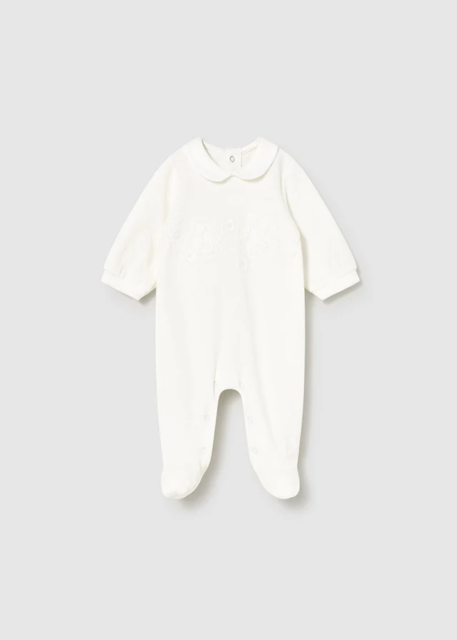 ¡Encantador y vestidor mameluco de color liso! Cuello camisero redondo, manga larga, flores bordadas en el pecho, cierre de botones a presion por atras y en la entrepierna para facilitar su puesta.