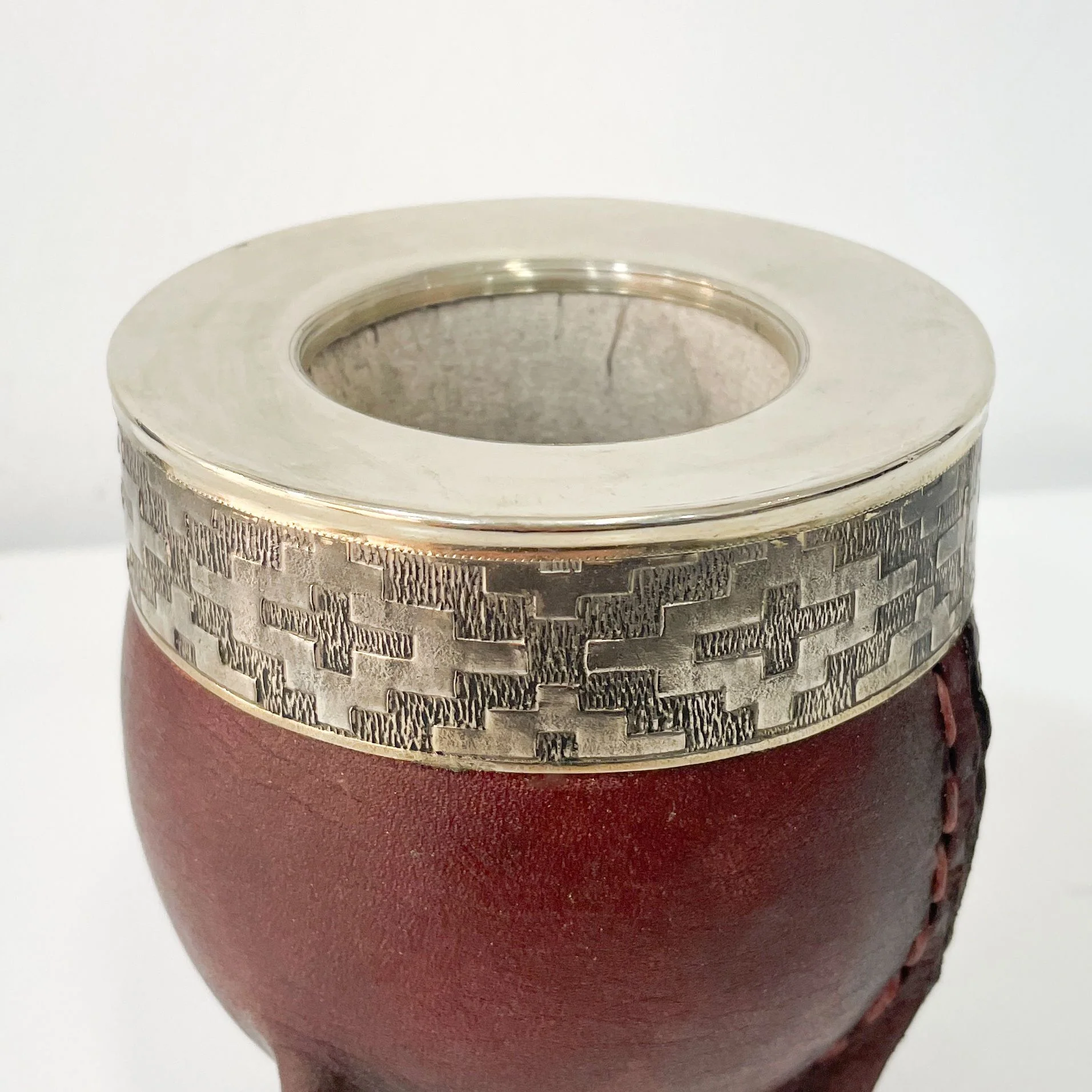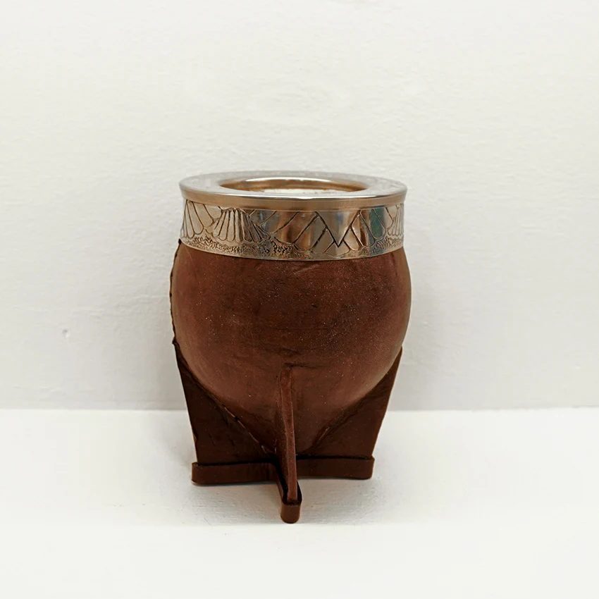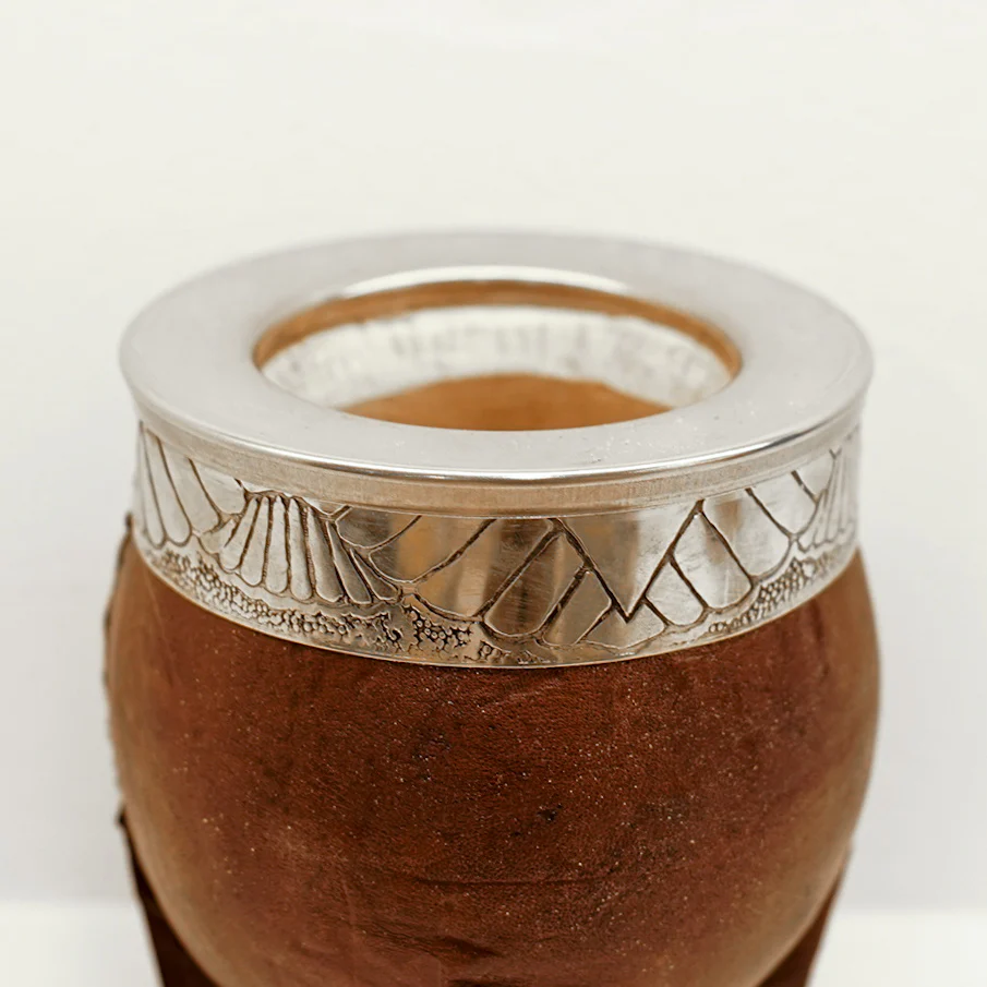 El exterior está recubierto con cuero trabajado a mano, lo que le da una apariencia refinada y elegante. La parte superior está decorada con un aro de aluminio grabado, con motivos artísticos, que refuerza la estructura y aporta un toque decorativo único.
