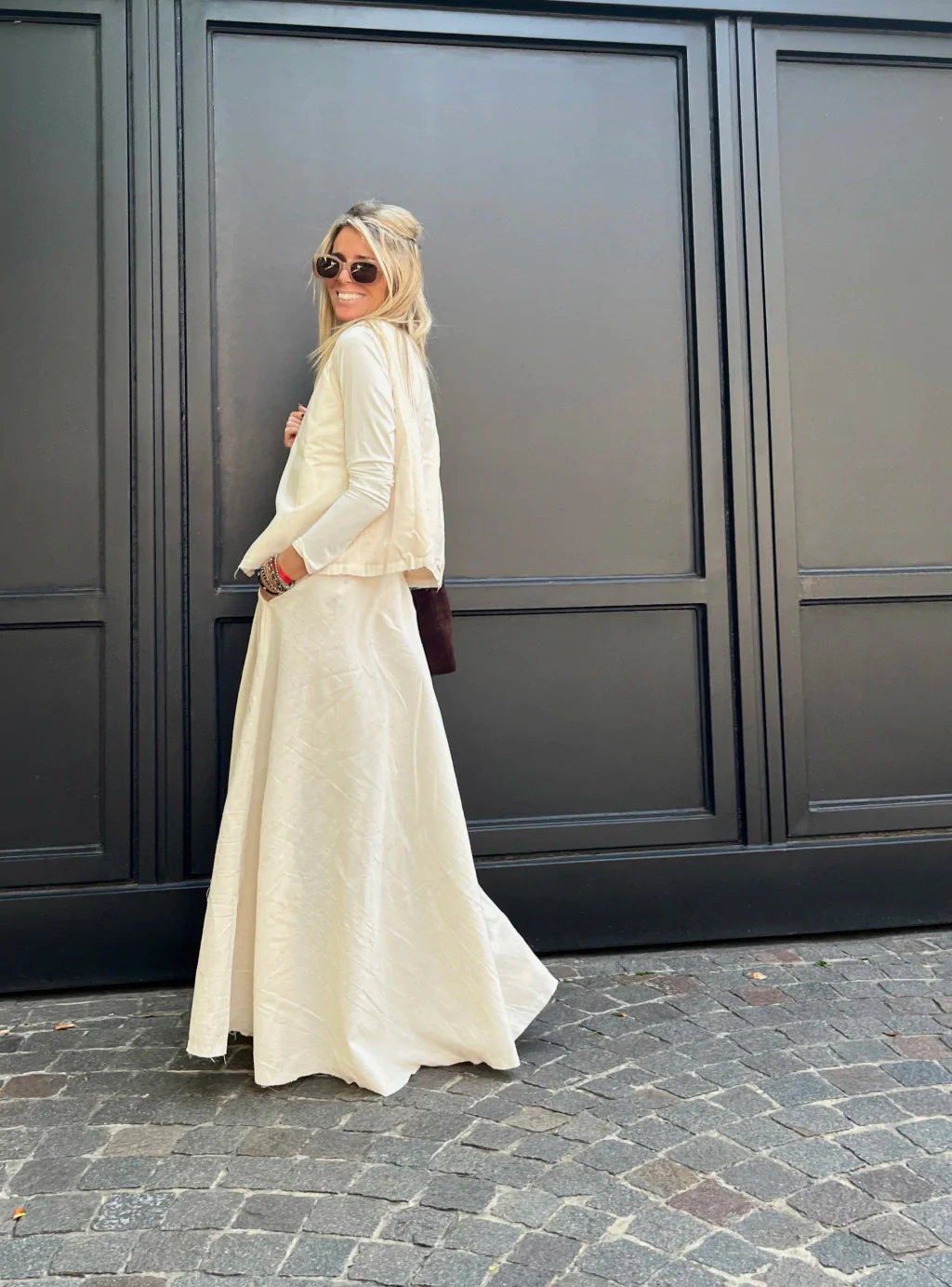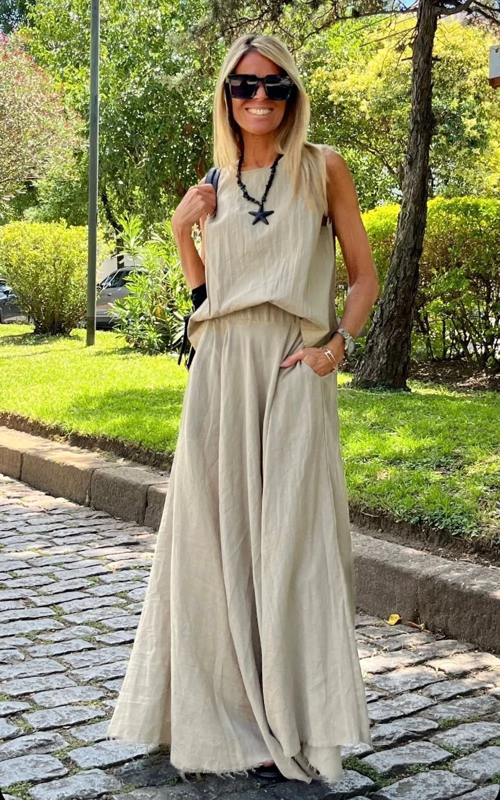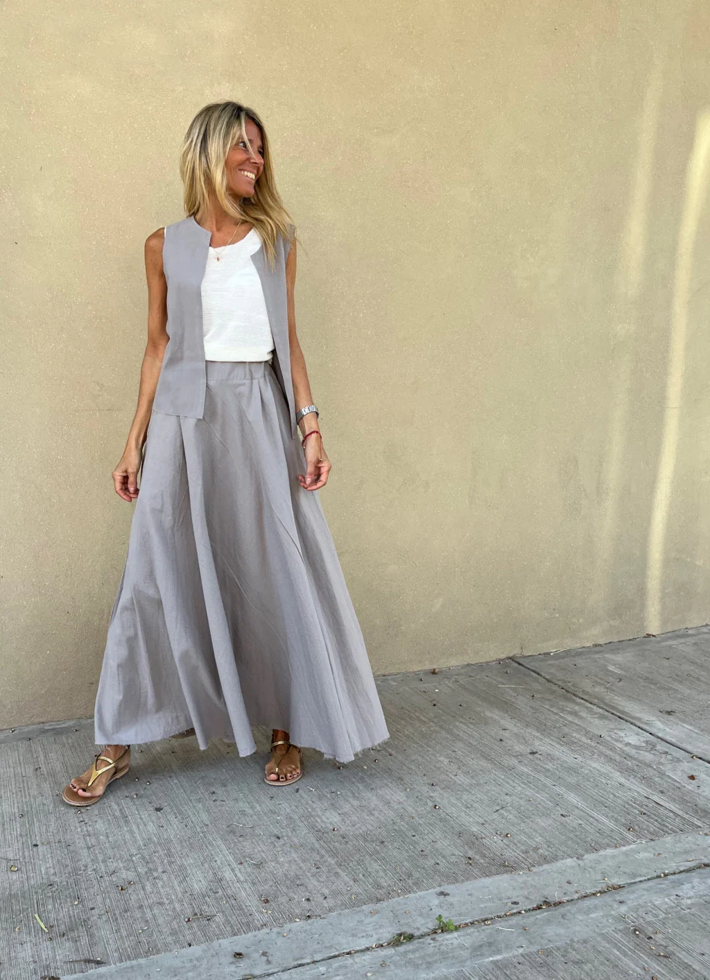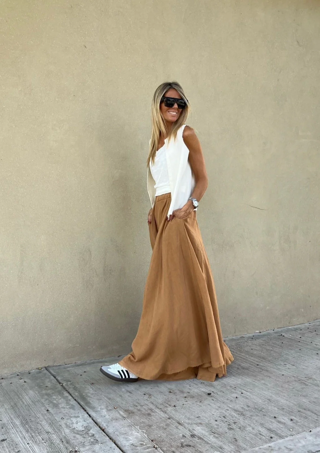 Falda amplia confeccionada en tusor, con elástico + cierre en la cintura para que se ajuste sin problemas y comodÃsimos bolsillos laterales. Fresca y versátil para todos los dÃas. Tu mejor aliada de verano lista para acompañarte en todos tus planes.