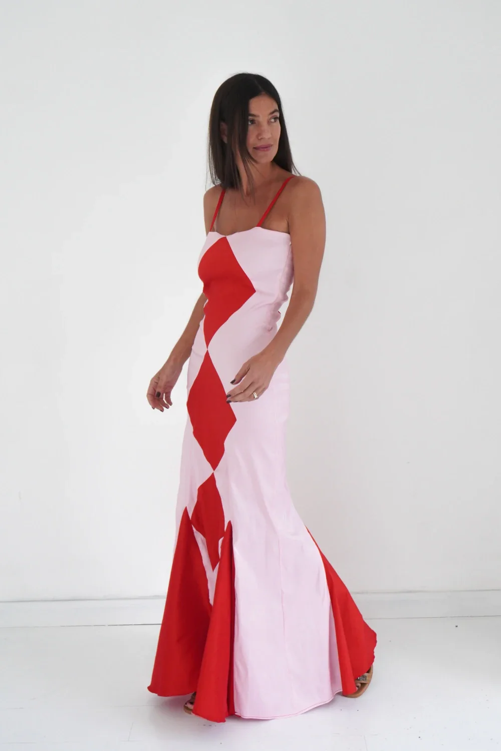 Confeccionado en tela elastizada, largo asimétrico, con cola corta que sugiere movimiento, y breteles delicados.