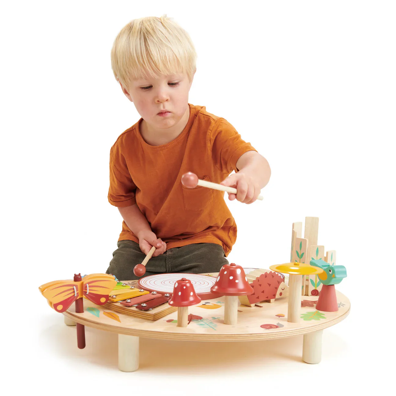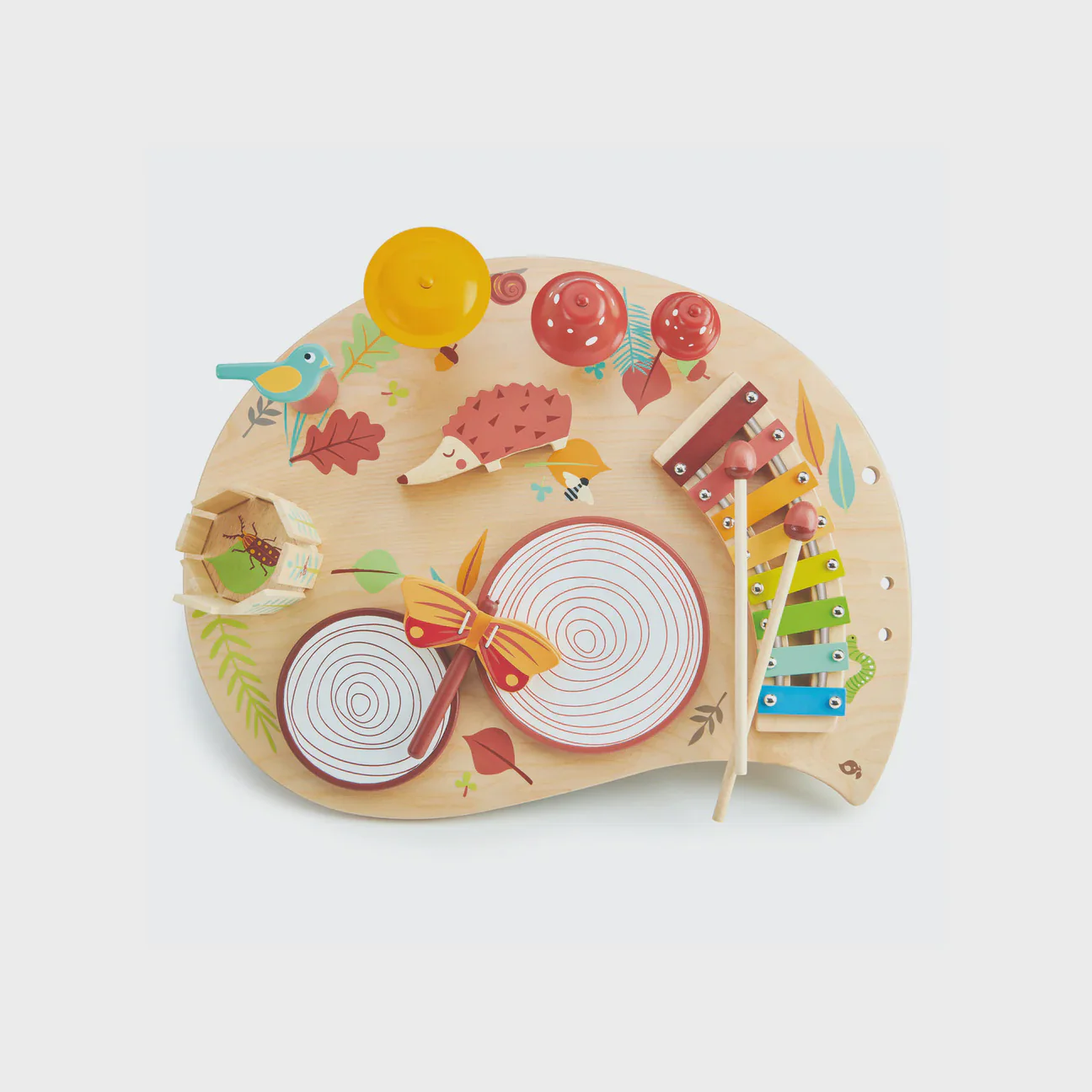¡Hermosa, educativa y divertida mesa musical diseñada para estimular la creatividad y el desarrollo sensorial de los niños! Fabricado con madera durable y pintura no tóxica, este set incluye dos tambores en forma de tronco, un xilófono de colores, un platillo amarillo, un silbato en forma de pájaro, dos campanas en forma de setas, una mariposa de clic-clac, un carillón de madera y dos baquetas de madera.