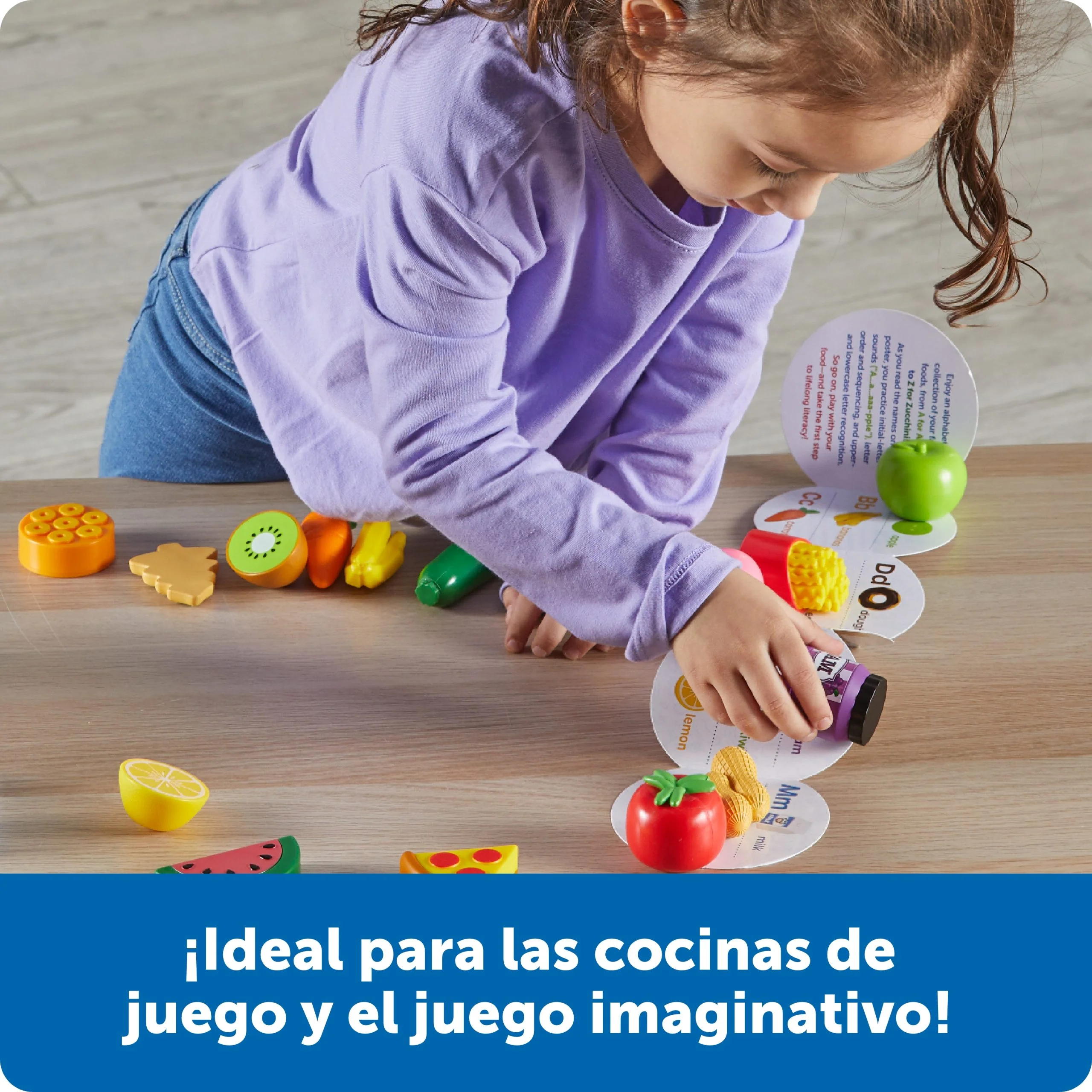 ¡Adorables mini alimentos que ayudan al aprendizaje del abecedario! 26 mini alimentos de plástico blando que corresponde a una letra diferente del abecedario: desde una adorable manzana hasta un sabroso calabacín ¡Es una forma deliciosa de aprender el abecedario! Este set incluye un menú desplegable ilustrado que ayuda a los niños a desarrollar su vocabulario y su imaginación mientras aprenden las letras, además de un cubo de plástico reutilizable para facilitar la limpieza.