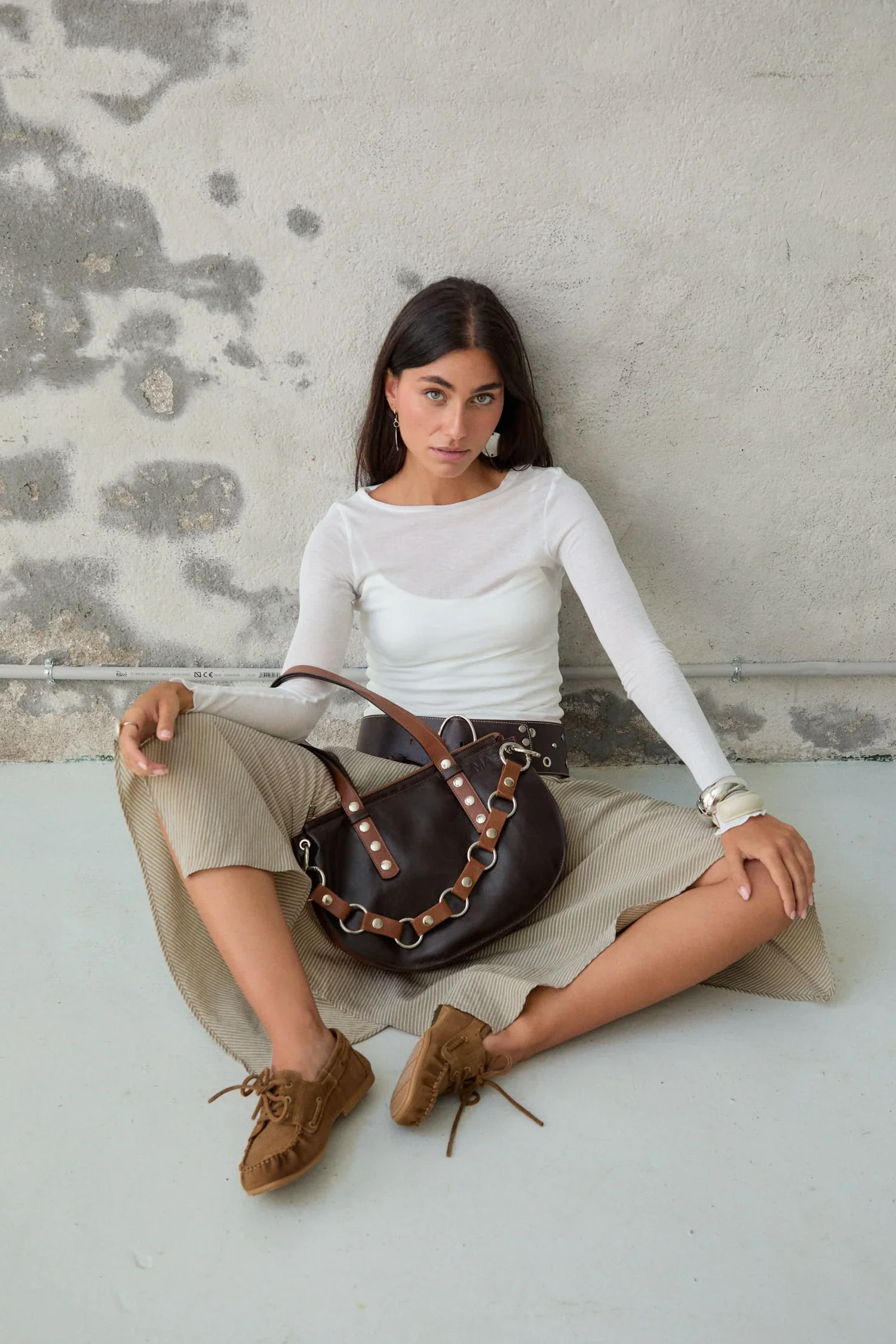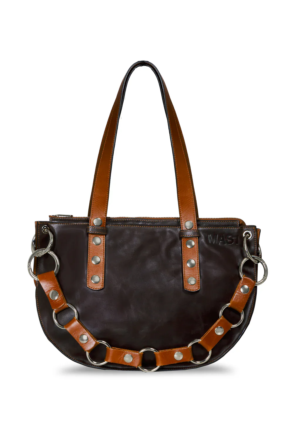 Bolso de piel de vacuno con dos tonos de marrón combinados. Viene con un asa lisa de circulos decorativa. Cuenta con 3 bolsillos internos de forro beige. Cabe hasta un ordenador de 13 pulgadas.