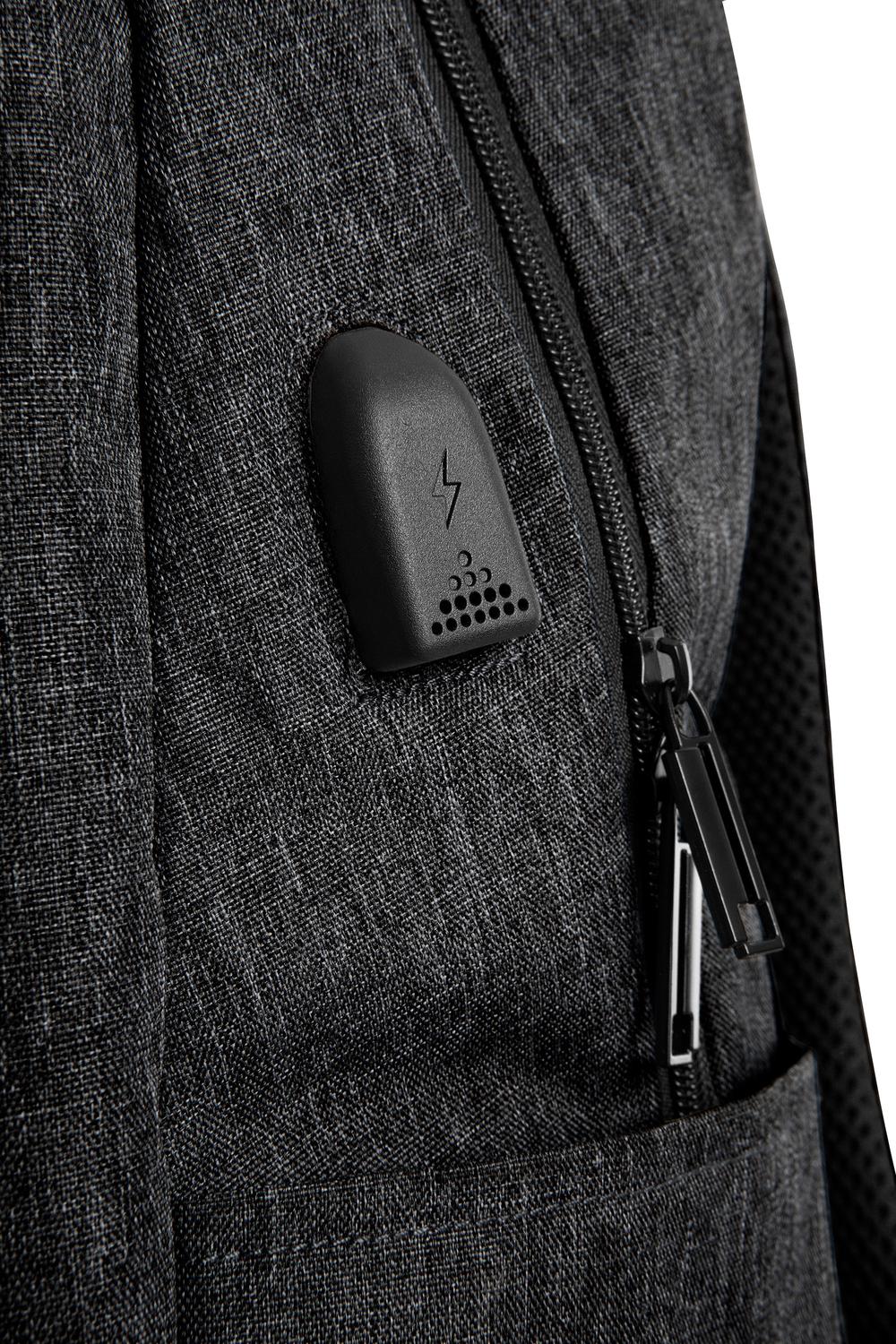 Mochila deportiva en combinación de materiales con múltiples compartimentos de apertura con cierre, espacio interno para computadora portátil o documentos, dispositivo de carga auxiliar USB, asas ajustables para hombros y asa de mano.prod. # 03-0718