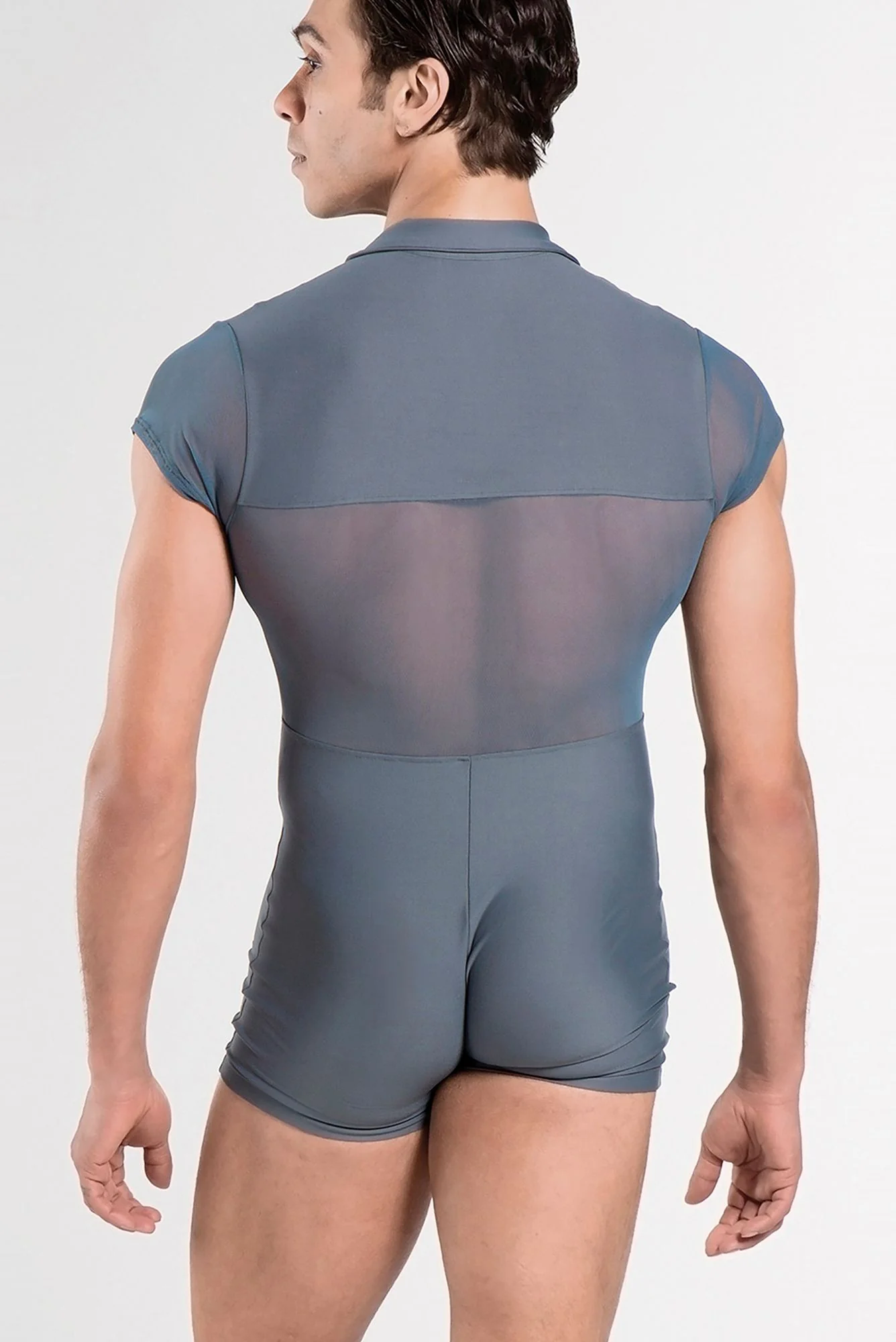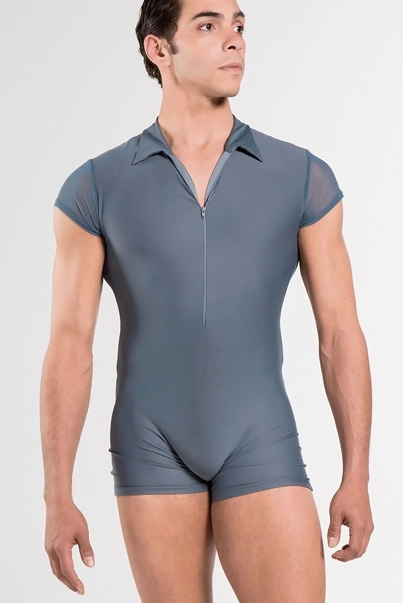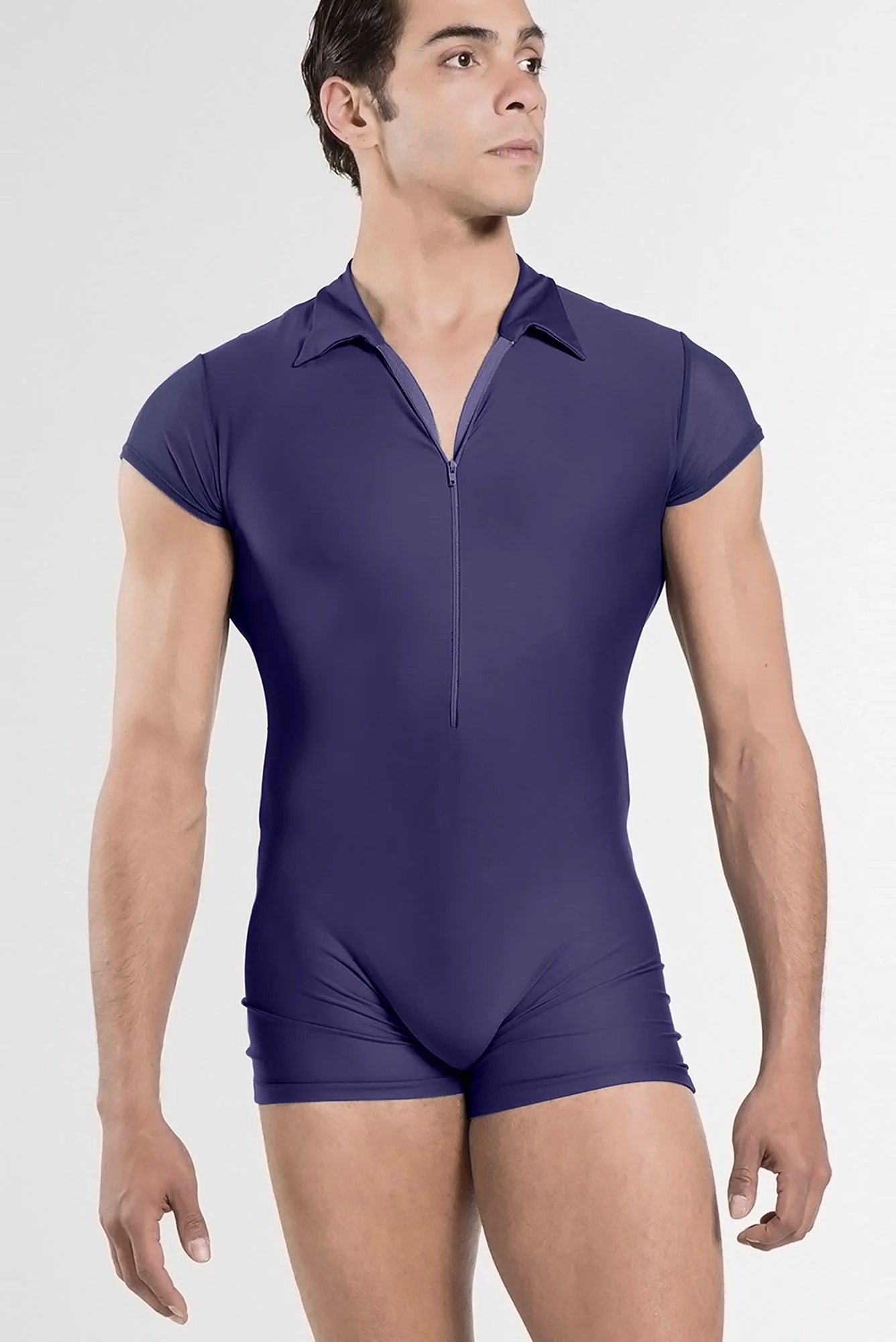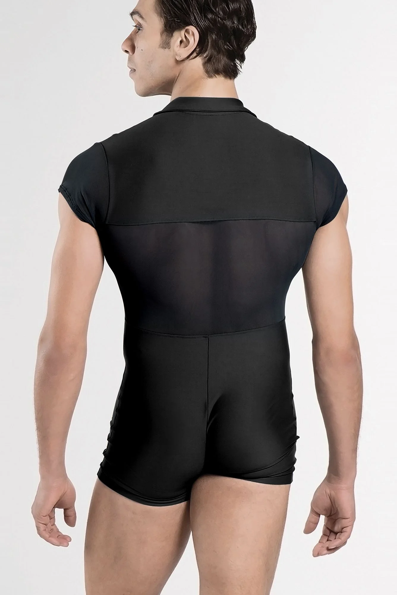 El modelo ROMEO de Wear Moi es ideal para hombre en clase de danza. La parte delantera y culotte es en microfibra lisa combinada con tulle en las mangas y espalda. Se ajusta perfectamente al cuerpo y se cierra con cremallera en la parte delantera.