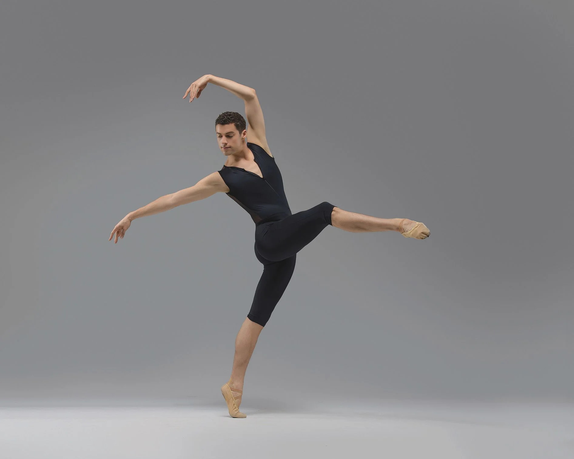 Mono de ballet para chico. El modelo ALDO de Ballet Rosa es ideal para hombre en clase de danza. Sin mangas corta con estampado print. Malla ciclista a la altura de la rodilla y cremallera en el pecho.