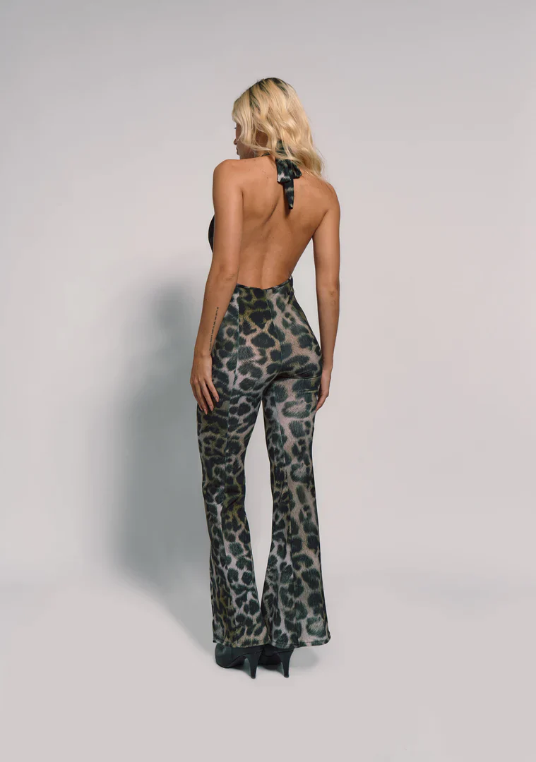 Mono largo de estampado animal print, que imita la piel de leopardo en tonos oscuros. El diseño es ajustado al cuerpo, lo que resalta la figura. El mono presenta un escote profundo en forma de ‘Y’, bastante pronunciado. Lleva doble forro y copas en el pecho. Los tirantes se atan detrás del cuello, tipo halter, dejando la espalda completamente descubierta. Las piernas son de corte recto y largo, ajustadas en las caderas y más sueltas hacia los tobillos, lo que crea una silueta estilizada y alargada.