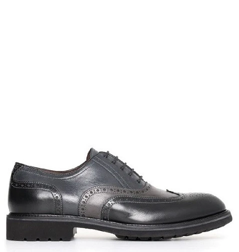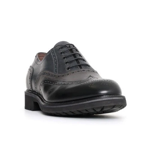 Originales zapatos para señor de corte clásico con cordones, fabricados en piel parcialmente punteada en diferentes tonalidades grises en la parte superior e intermedia y color negro en la parte inferior.