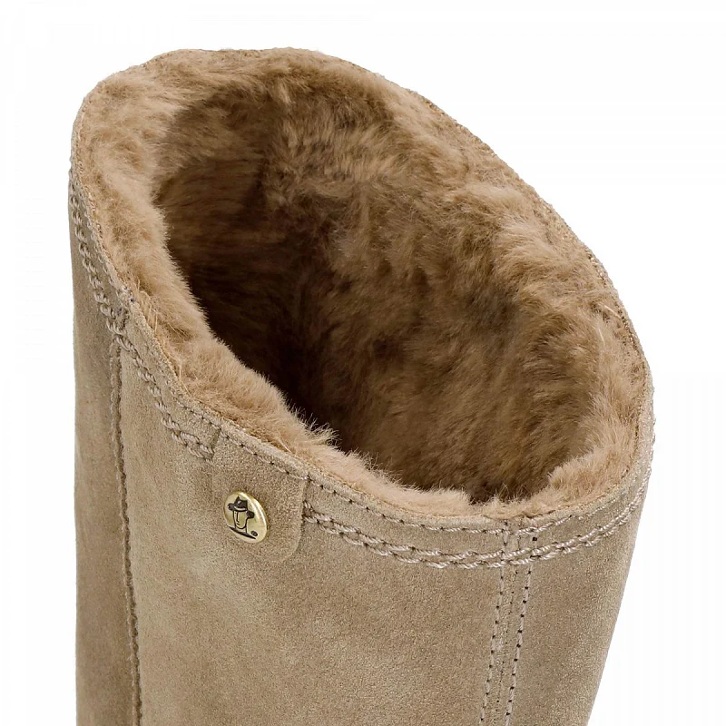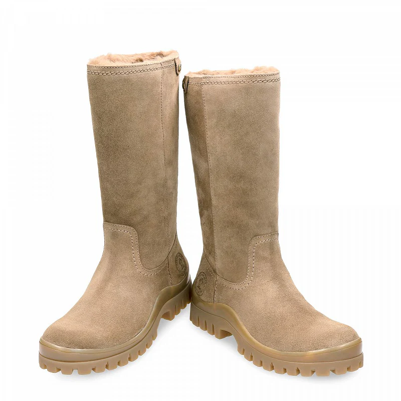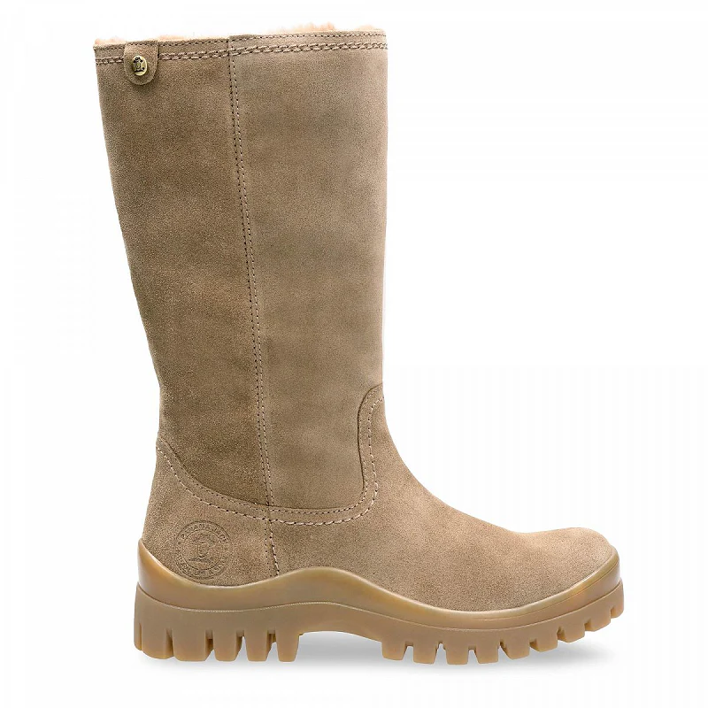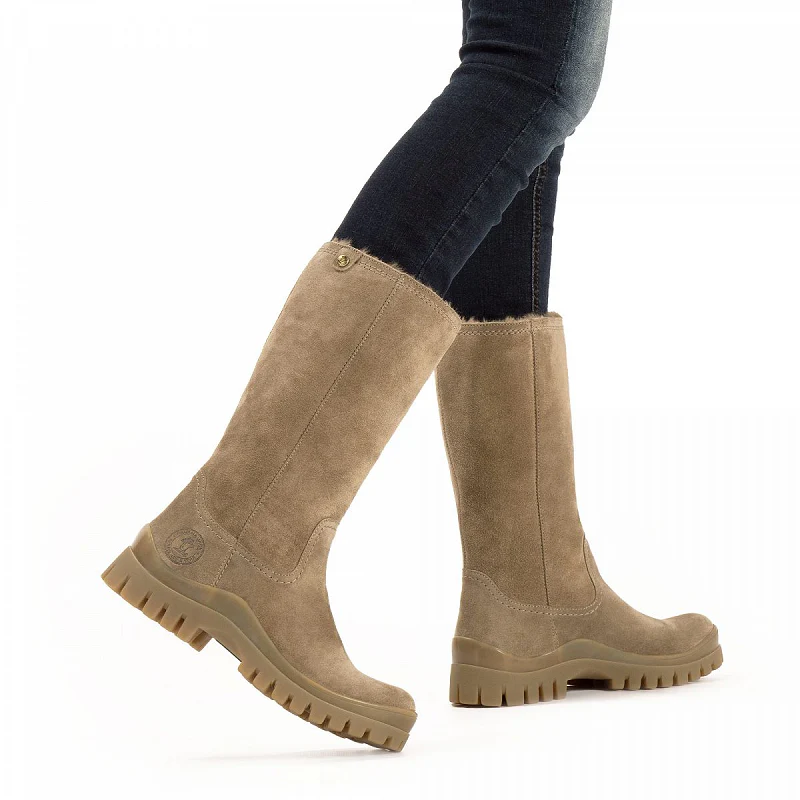 Bota de mujer de la marca Panama Jack plana echa de ante topo y tiene forro cálido. La plantilla es anatómica extraíble y la suela de goma flexible y duradera. Altura de la pierna: 32 cm.