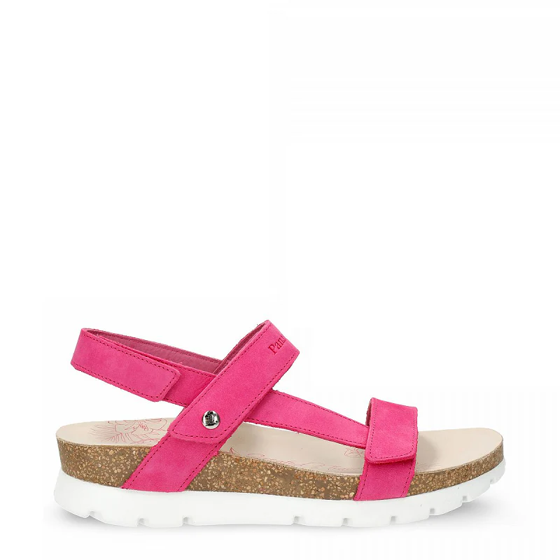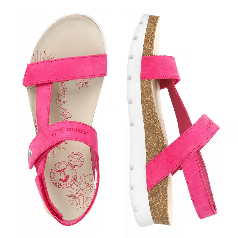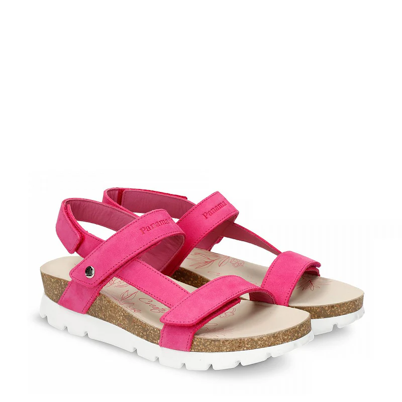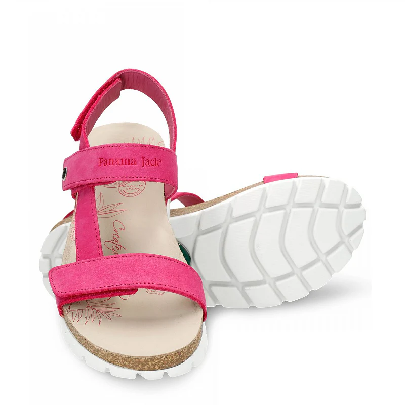Sandalia plana de mujer de la marca Panama Jack con cierre de velcro. Están echas de piel Nobuck en color Fucsia con el forro interior de Piel. La plantilla es anatómica y la suela de poliuretano, flexible y resistente. Altura tacón: 4.5 cm.