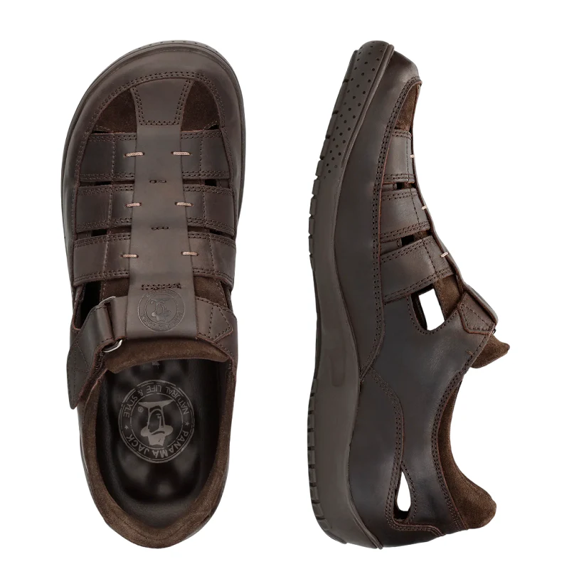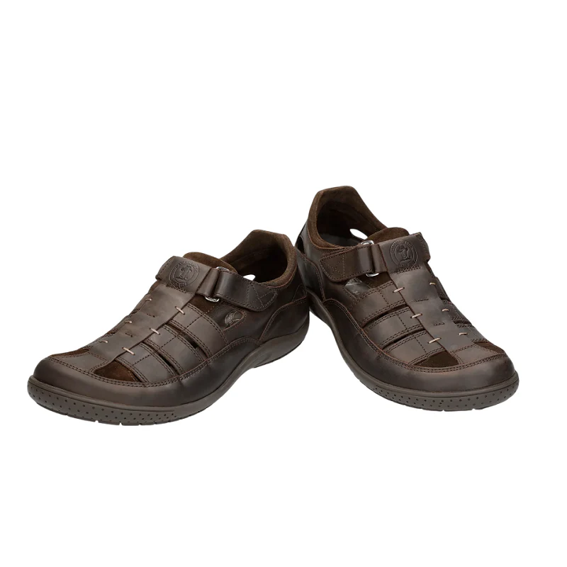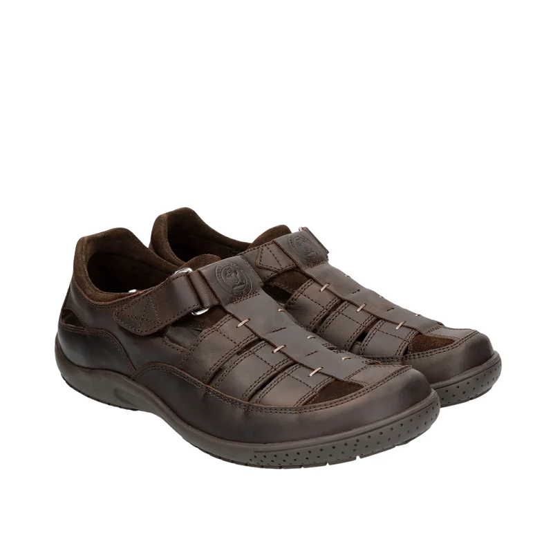Zapato semiabierto de hombre. Piel Napa Grass marrón. Cierre de velcro. Forro interior de Lycra. Plantilla anatómica extraíble con acolchado Softsystem, amortigua la pisada durante todo el día. Suela de caucho natural, flexible y resistente. Altura tacón: 4 cm. 100% Hecho en España.