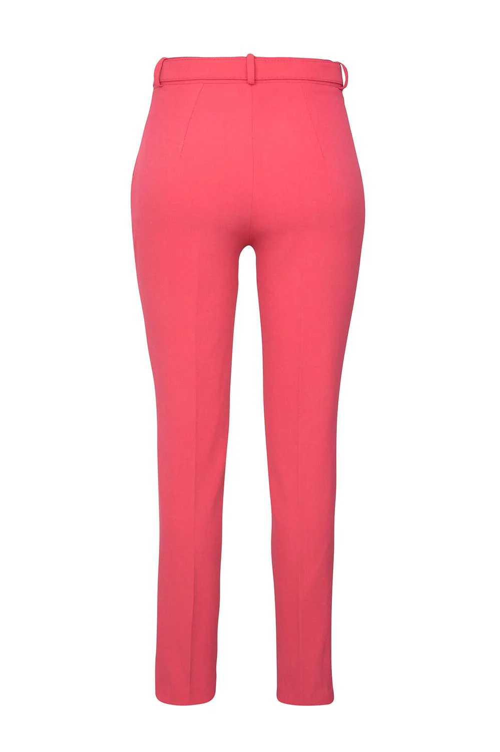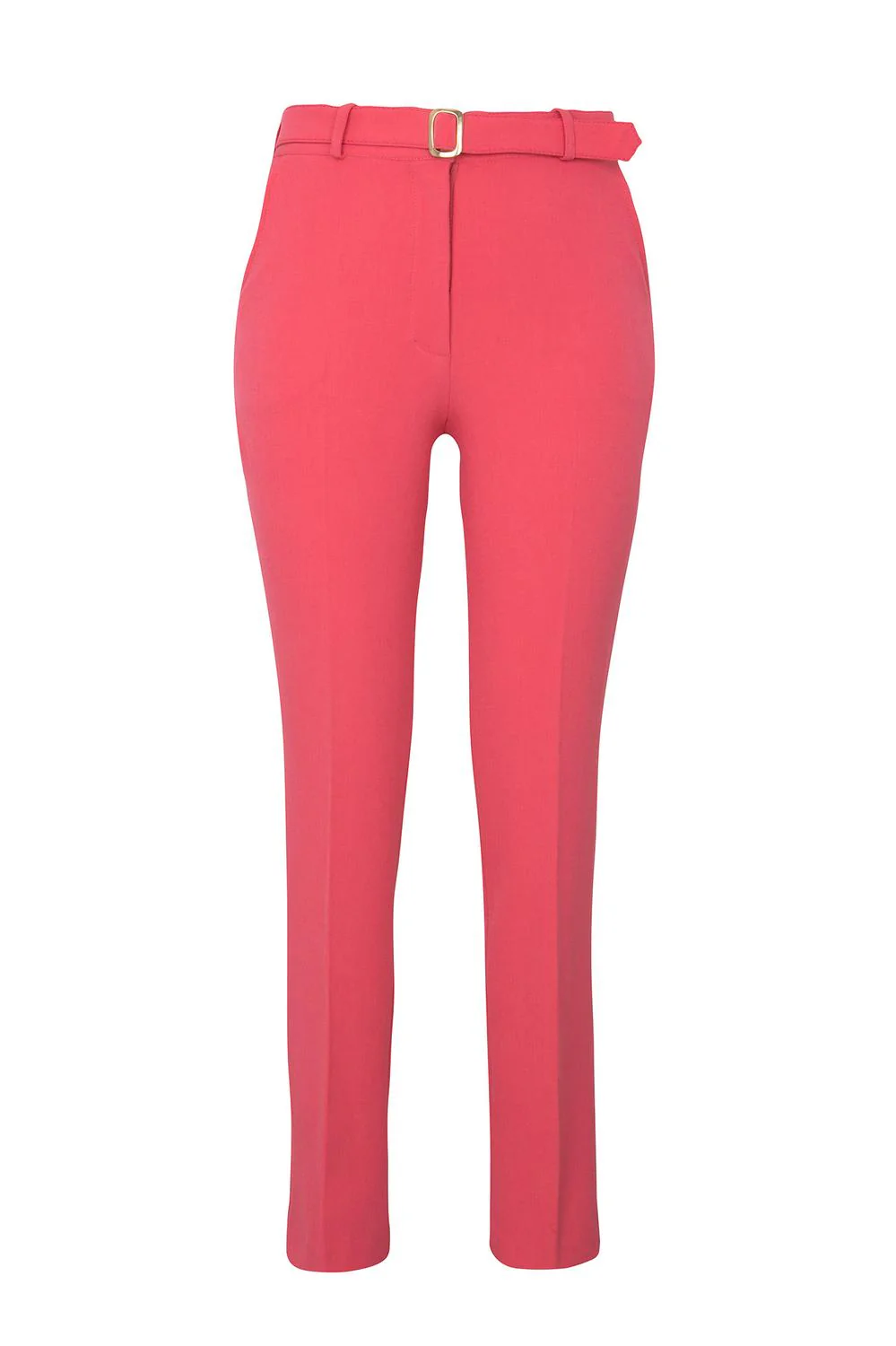 - Pantalón de tiro alto, corte recto, bolsillos frontales, cinturón a tono y hebilla metálica.