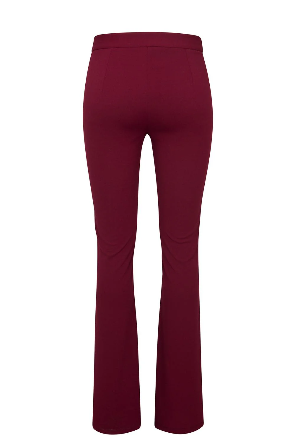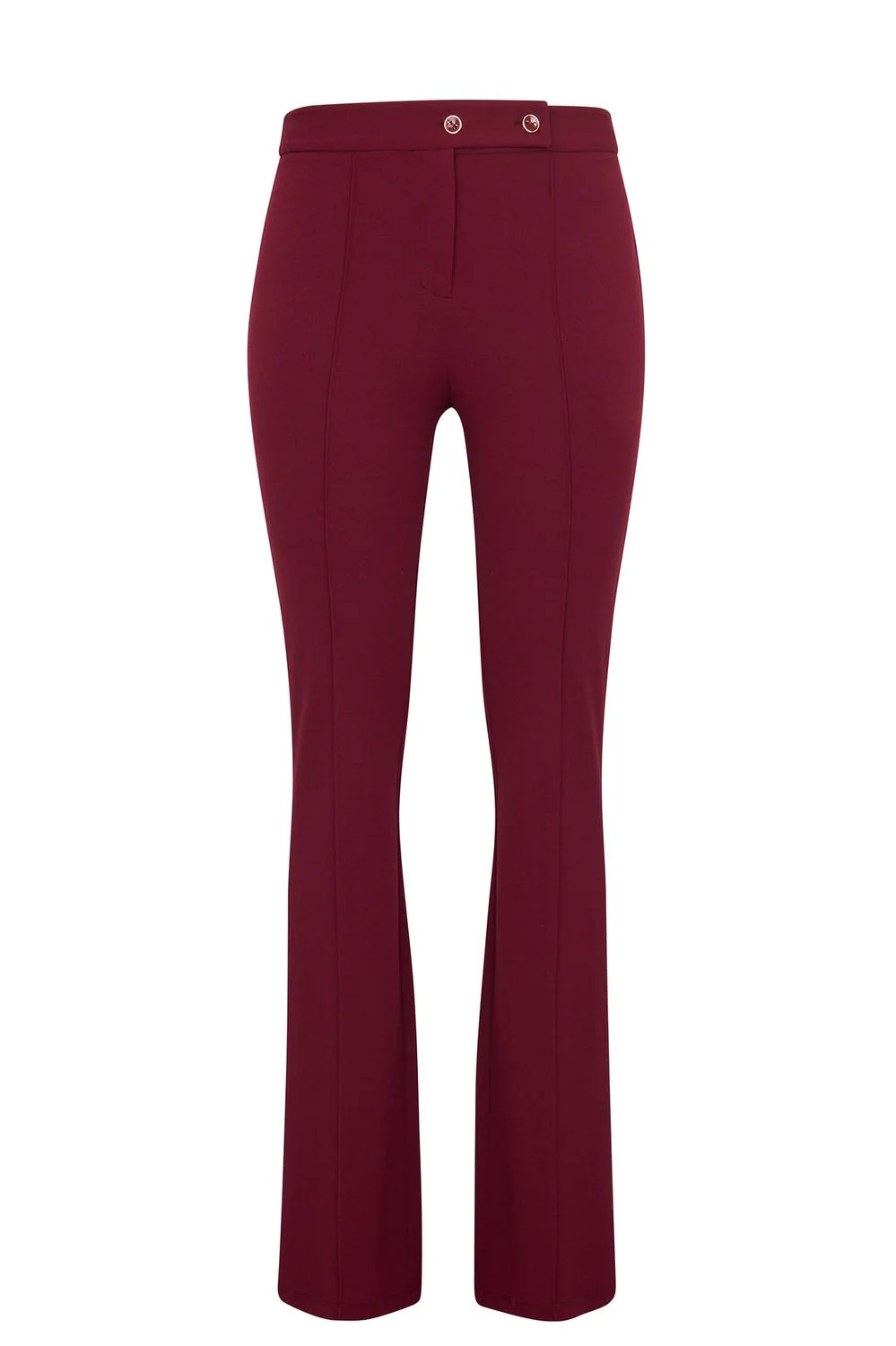 • Pantalón a la cintura con alforzas decorativas frontales y corte acampanado.