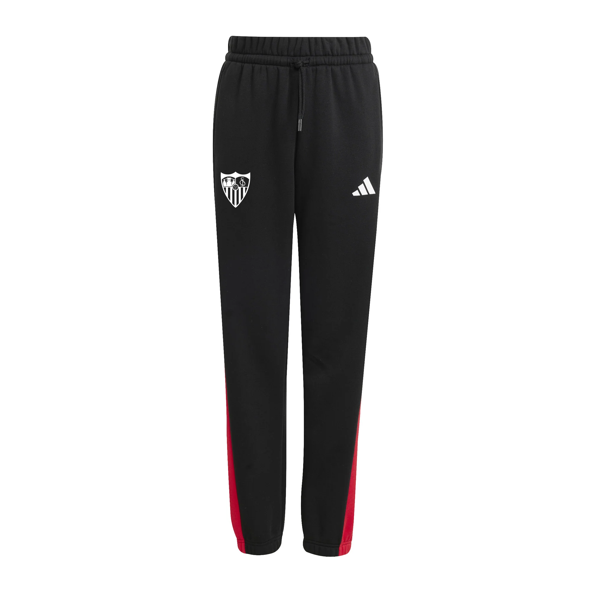 Perteneciente a la Colección Oficial del Sevilla Fútbol Club para la temporada 25/26, este pantalón negro de chándal para niños, detalles en rojo y el logo del sponsor técnico y escudo del Club serigrafiados en rojo.