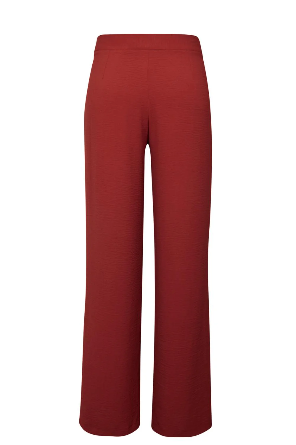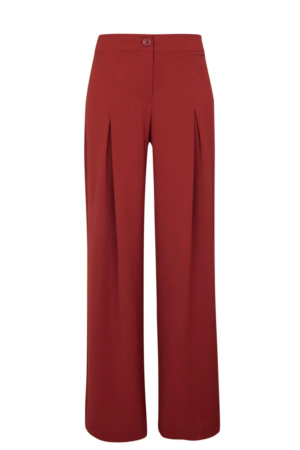 - Pantalón largo de pierna ancha con pretina, botón frontal, cierre oculto, pliegues decorativos.