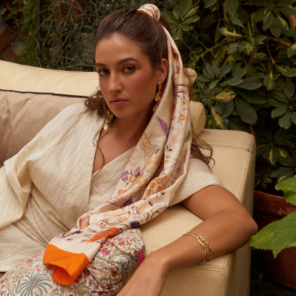 Cuarterones con aves del paraíso y leones fú en una gama cromática suave de grises, malvas y naranja sobre seda marfil.