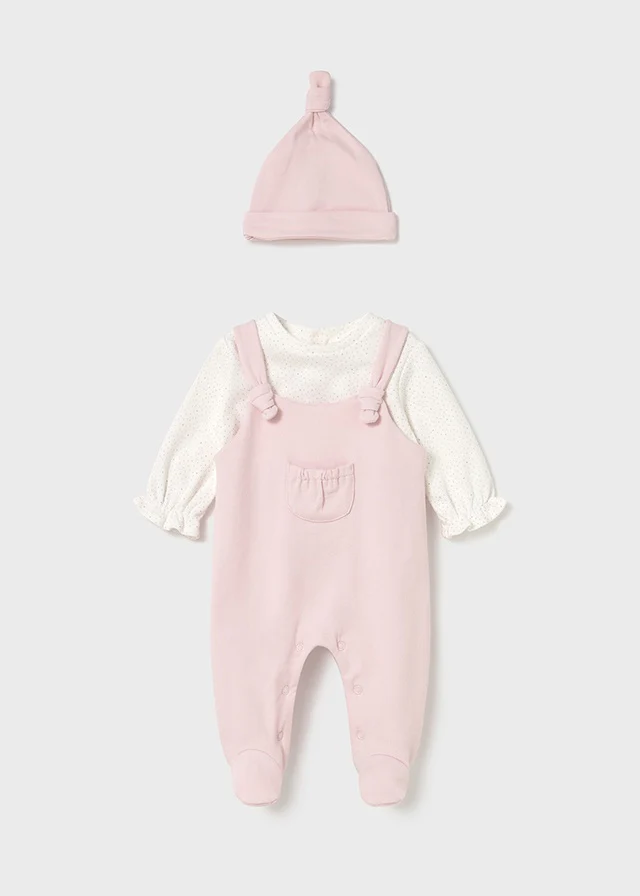 ¡Divino y tierno set de mameluco con su gorrito a juego! Mameluco de cuello redondo, manga larga con elastico en puños, diseño con overol simulado sobrepuesto, de lazo en tirantes, diseño estampado, bolsillo en el pecho y cierre con botones a presión en la parte posterior y en la entrepierna para facilitar la puesta de la prenda. Y con su gorro a juego hecho de materiales cálidos y flexibles, que garantizan un ajuste perfecto a la cabeza y máxima comodidad para protegerle del frío.