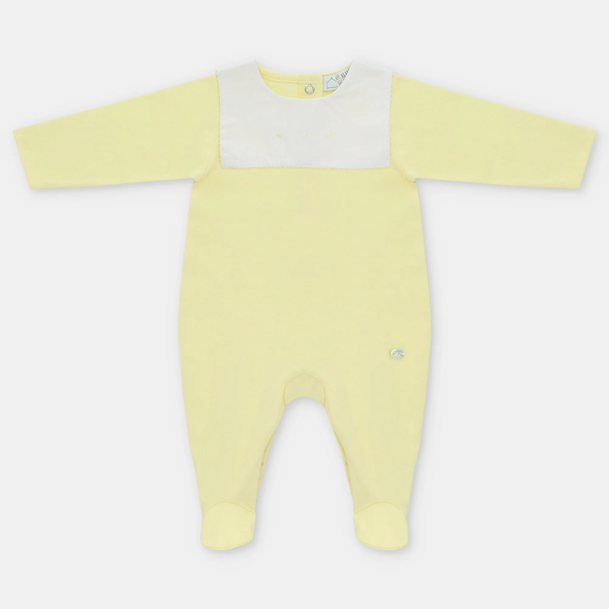 ¡Encantador mameluco con detalles que lo hacen lucir unico y elegante! De cuello redondo, manga larga, hermoso detalle de tela sobre puesta con bordado en el pecho. Cierre de botones a presion por la parte de atras y en la entrepierna para facilitar su puesta.