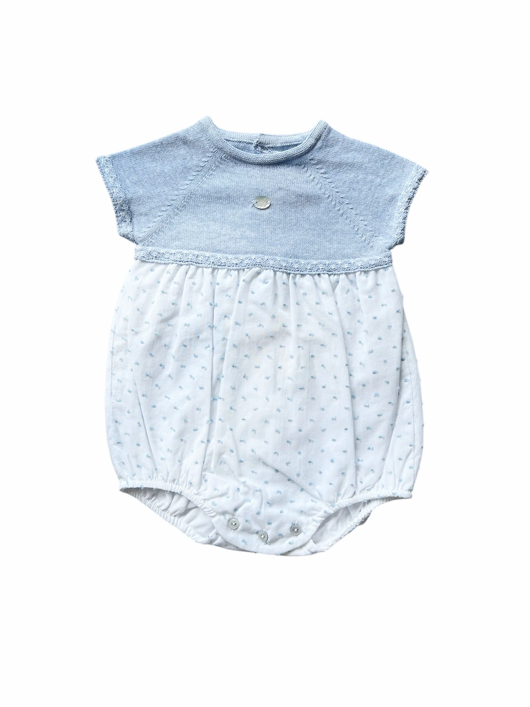 ¡Divino pañalero combinado de tejido con tela! Parte de arriba tipo tejido delgado, cuello redondo, manga corta, corte en la cintura de tela con plumeti. Cierre de botones por atras y en la entrepierna para facilitar su puesta.