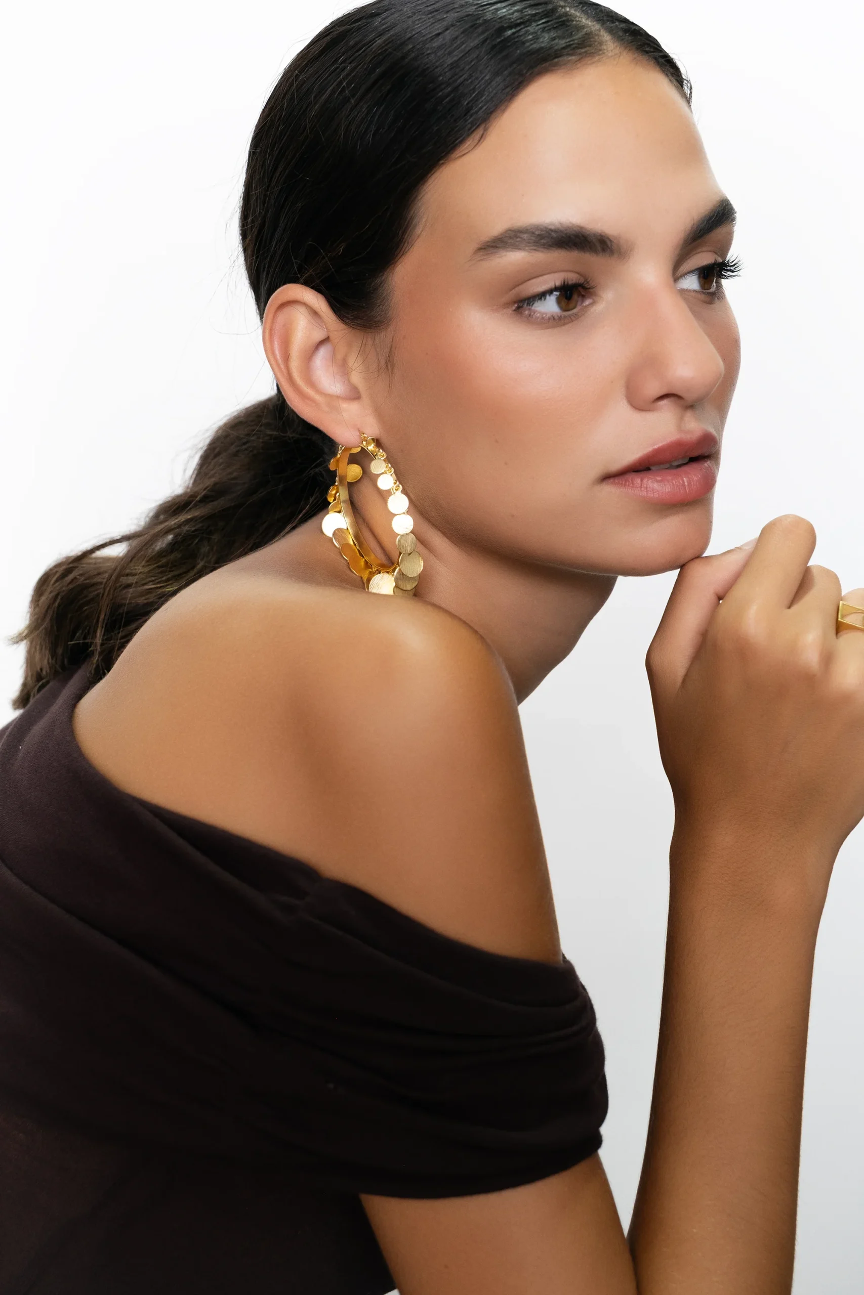 Aros originales con movimiento, formados por pequeñas chapas circulares dispuestas alrededor del aro de menor a mayor tamaño creando una especie de cascada.