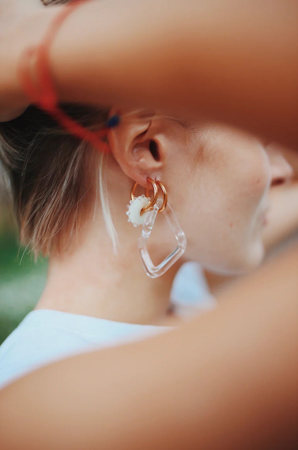 Los Pendientes Donas White están hechos a mano con vidrio de Murano, reconocido por su calidad y belleza artesanal. Su diseño de dona en color blanco aporta un toque elegante y moderno, perfecto para cualquier ocasión. En la imagen, estos pendientes están combinados con los Pendientes Irregulares White, creando un estilo único y llamativo.