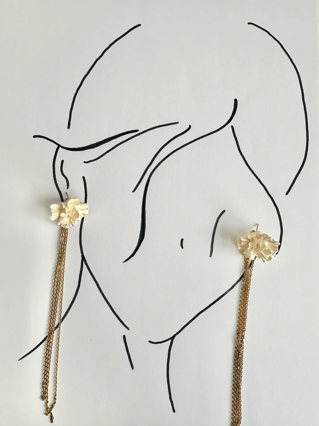 Pendientes de flor blanca con brillo con cadenas de acero inoxidable