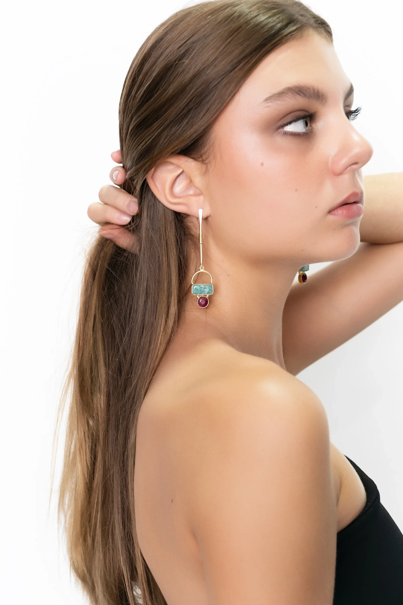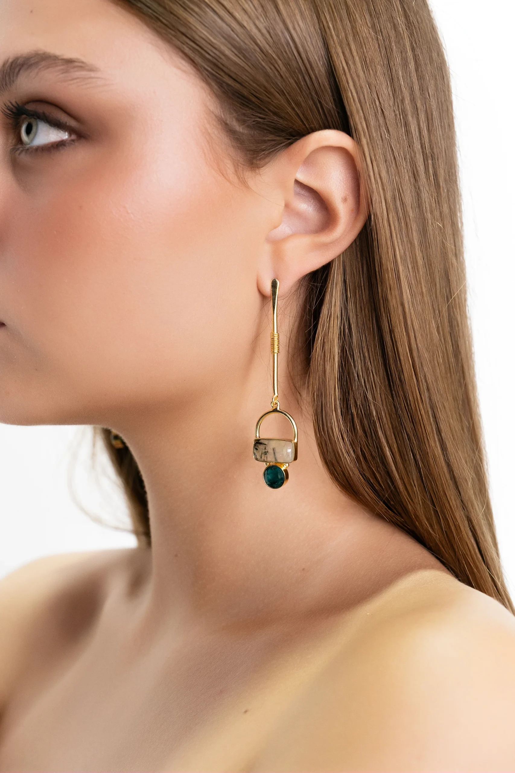 Pendientes largos de latón chapado en oro 22k. Cuelgan de una barra metálica fina que conecta con medio aro del cual le siguen dos piezas, una piedra rectangular y justo debajo, una piedra redonda, ambas enmarcadas en latón chapado en oro.