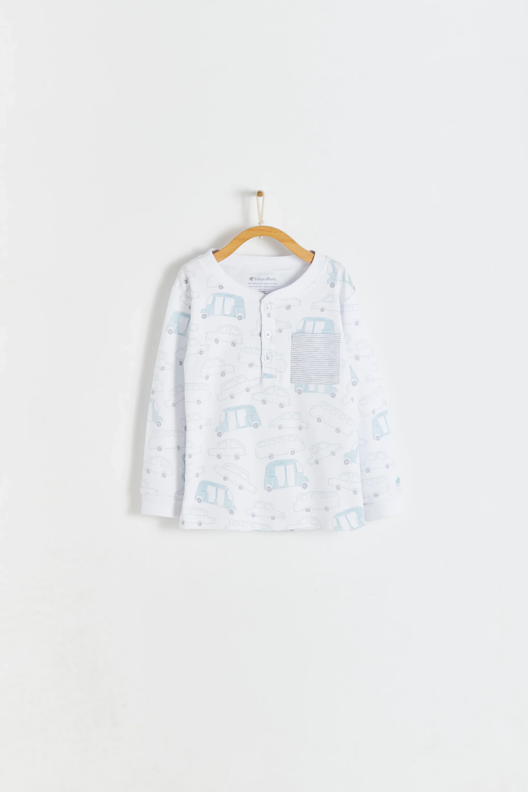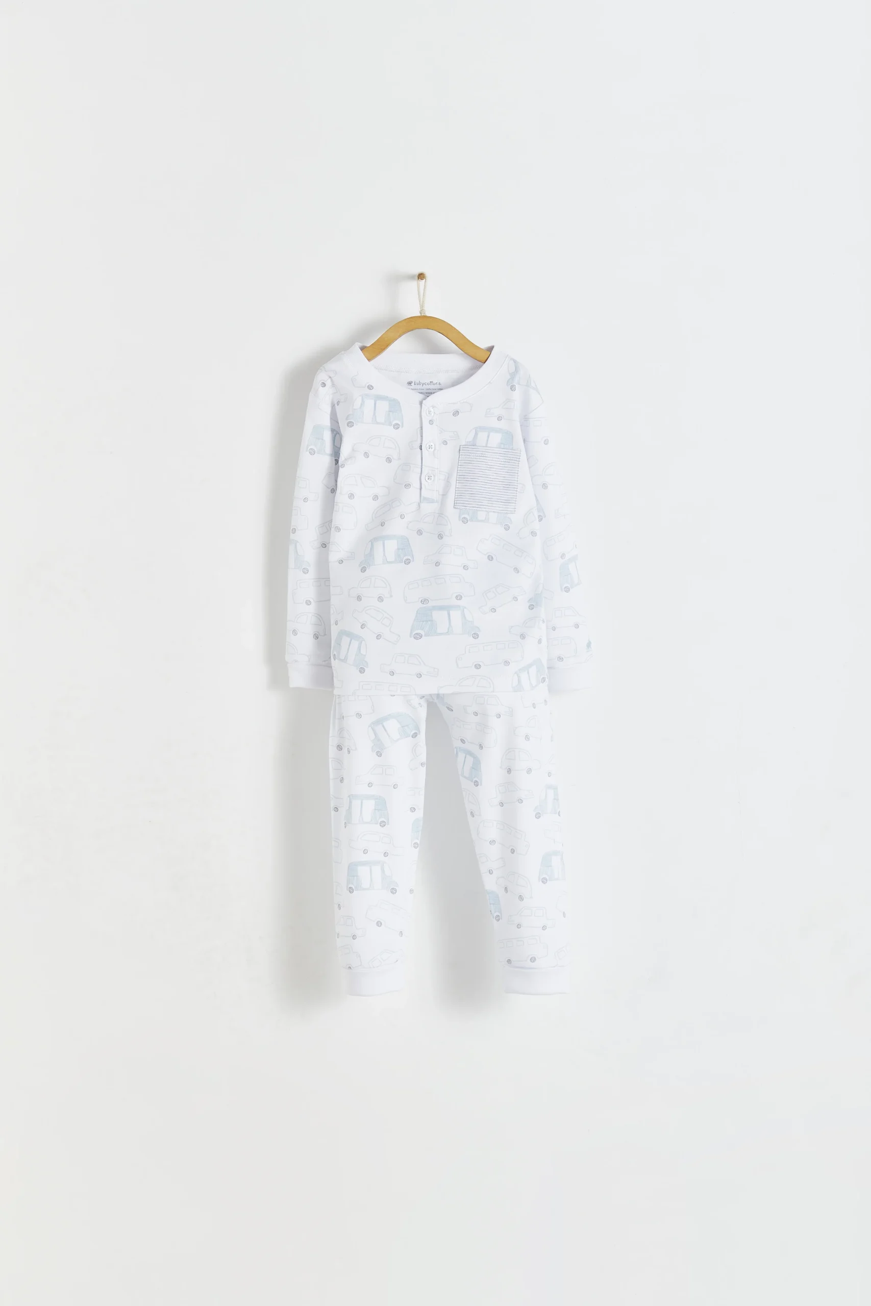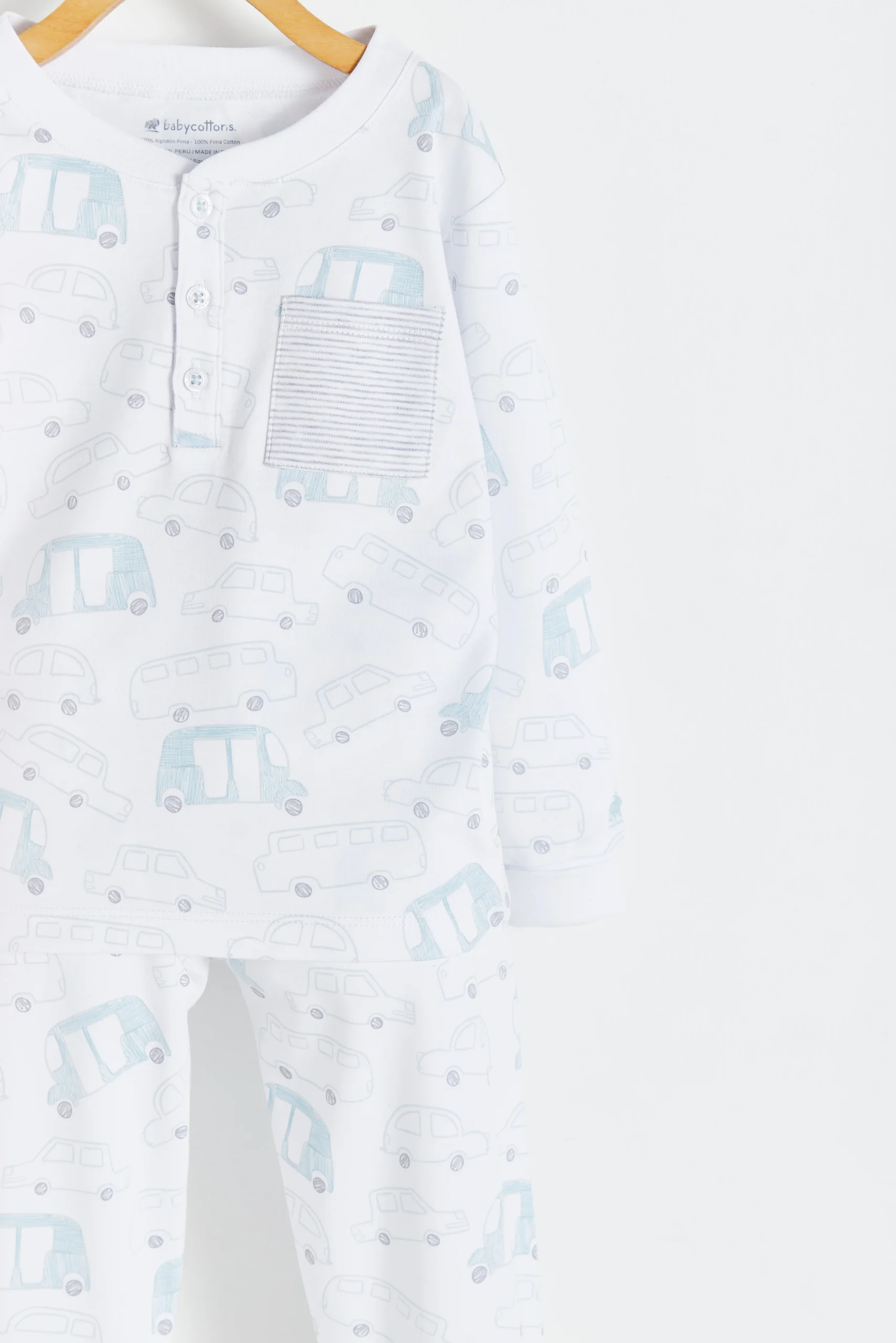 ¡Encantadora y comoda pijama de estampado de carros! De cuello redondo, cierre de botones por el frente, manga larga, detalle de bolsillo y pantalón con elastico en la cintura para mayor ajuste. Confeccionado en suave algodón pima que garantiza comodidad y suavidad para un sueño tranquilo ¡Un conjunto encantador y funcional para el niño de tela suave para el contacto con la piel!