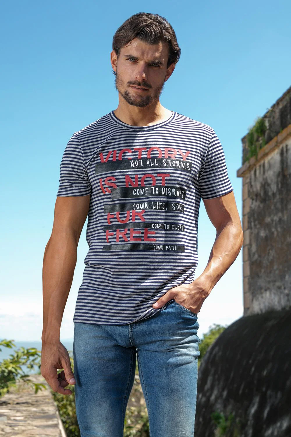 Playera a rayas con cuello redondo, mangas cortas y estampado en serigrafía frontal. Código de producto 34-0412