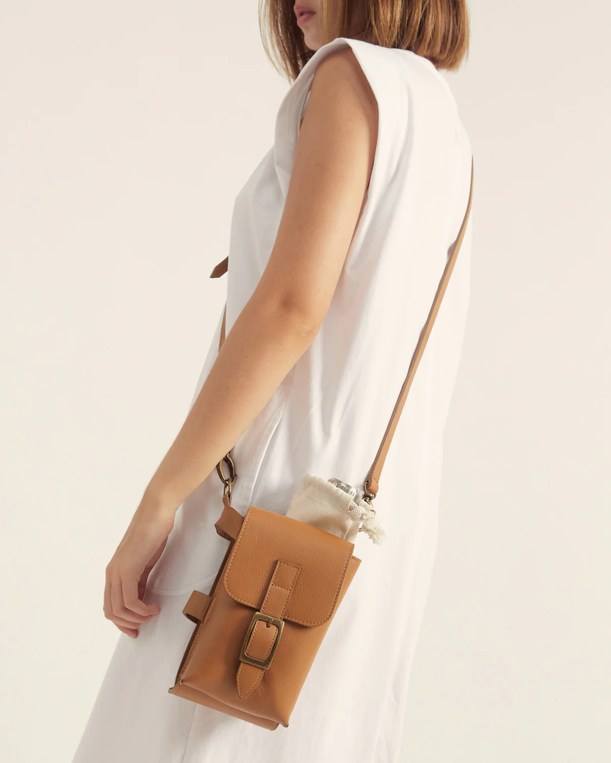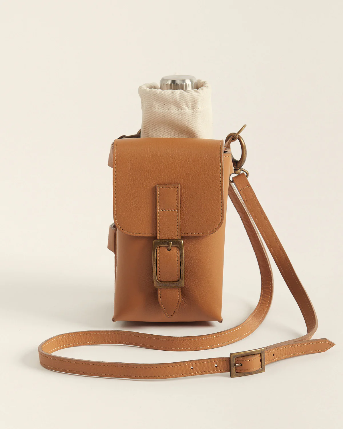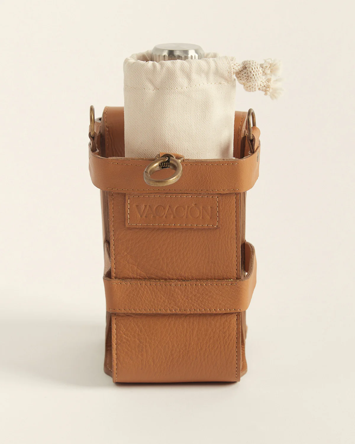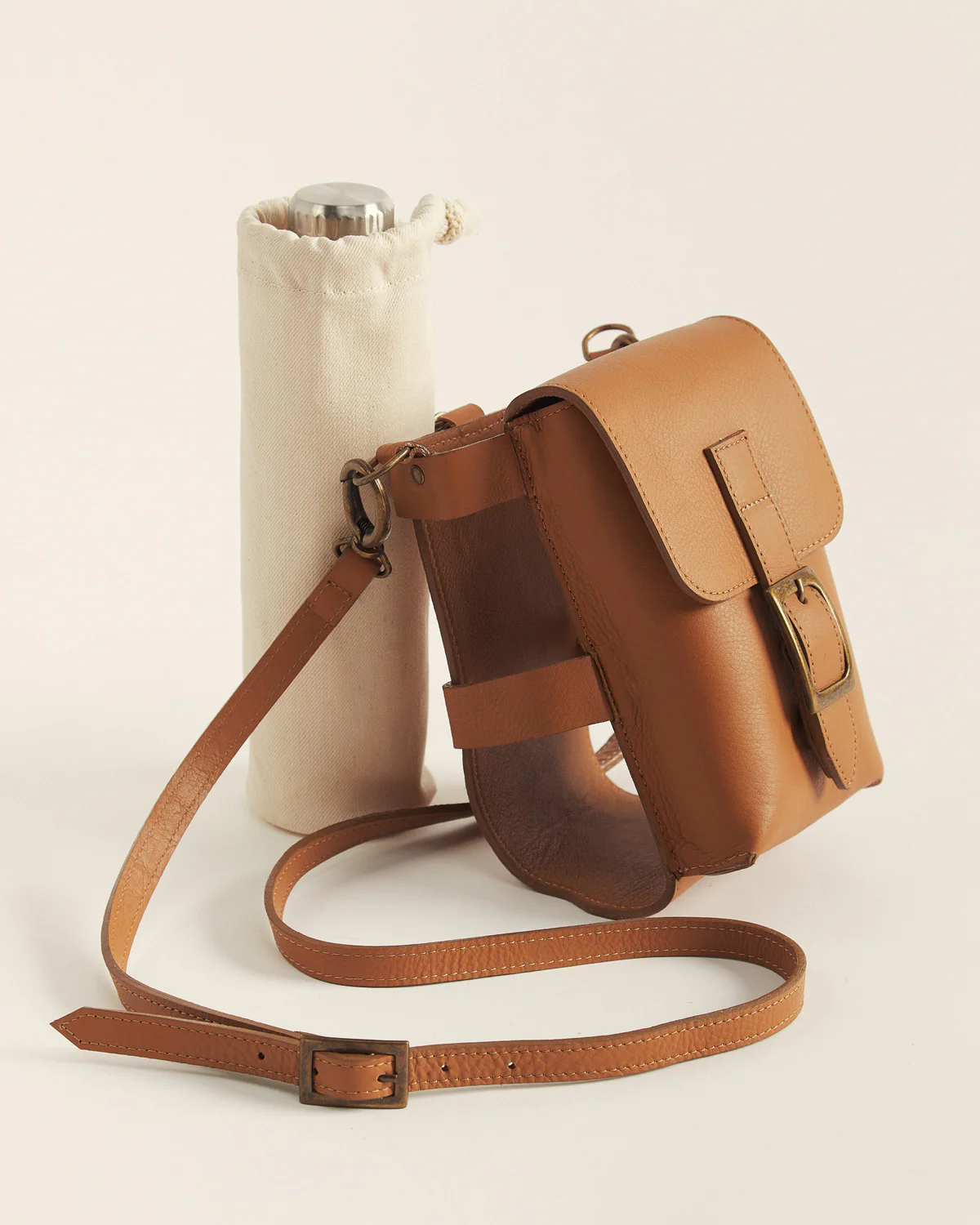 Incluye correa regulable de cuero y bolsa de tela para guardar botella de 500ml..