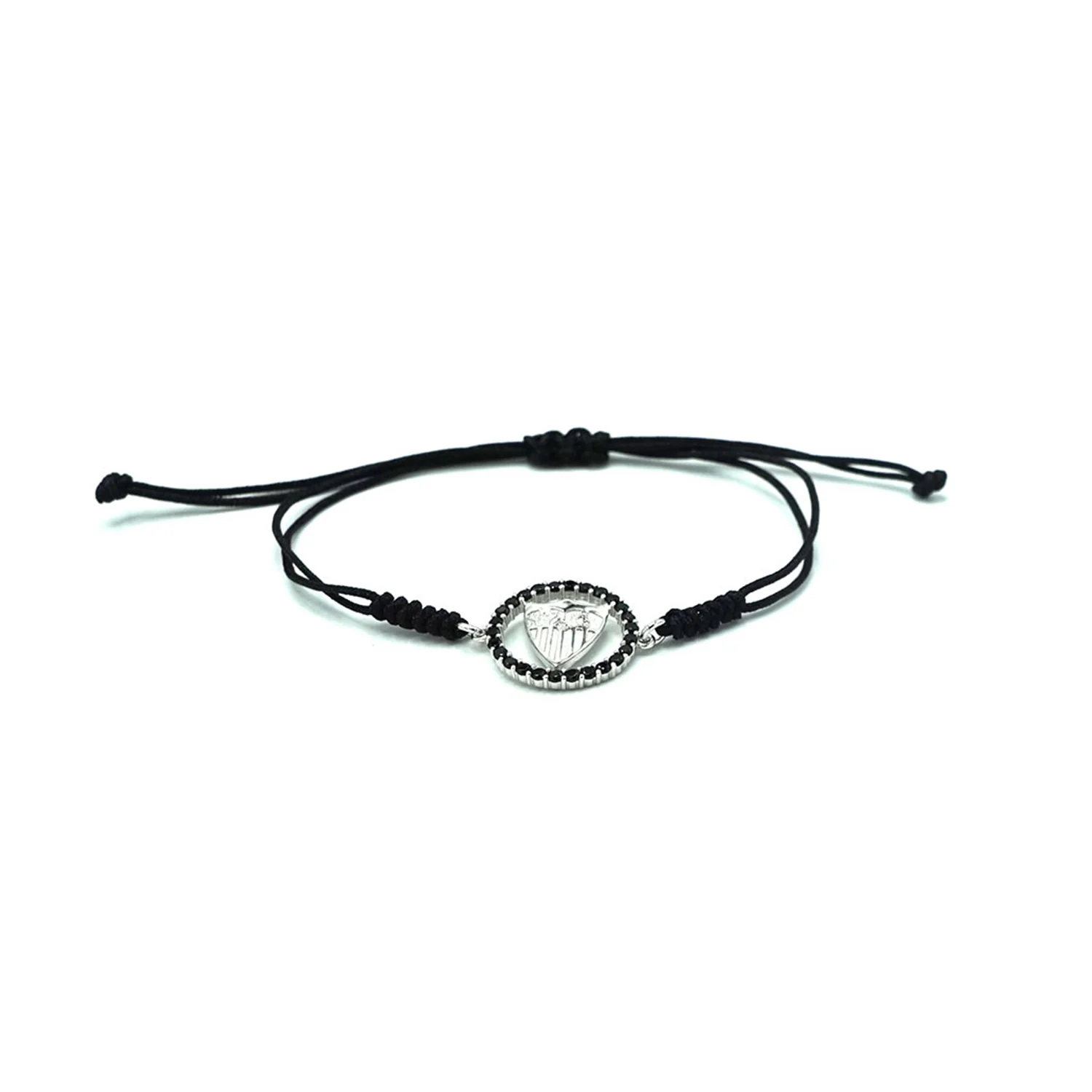 Pulsera de plata de ley con escudo del Sevilla Fútbol Club en relieve, dentro de un círculo de plata con circonitas negras. Medida Ø exterior: 1.60 cm. Con cordón de macramé