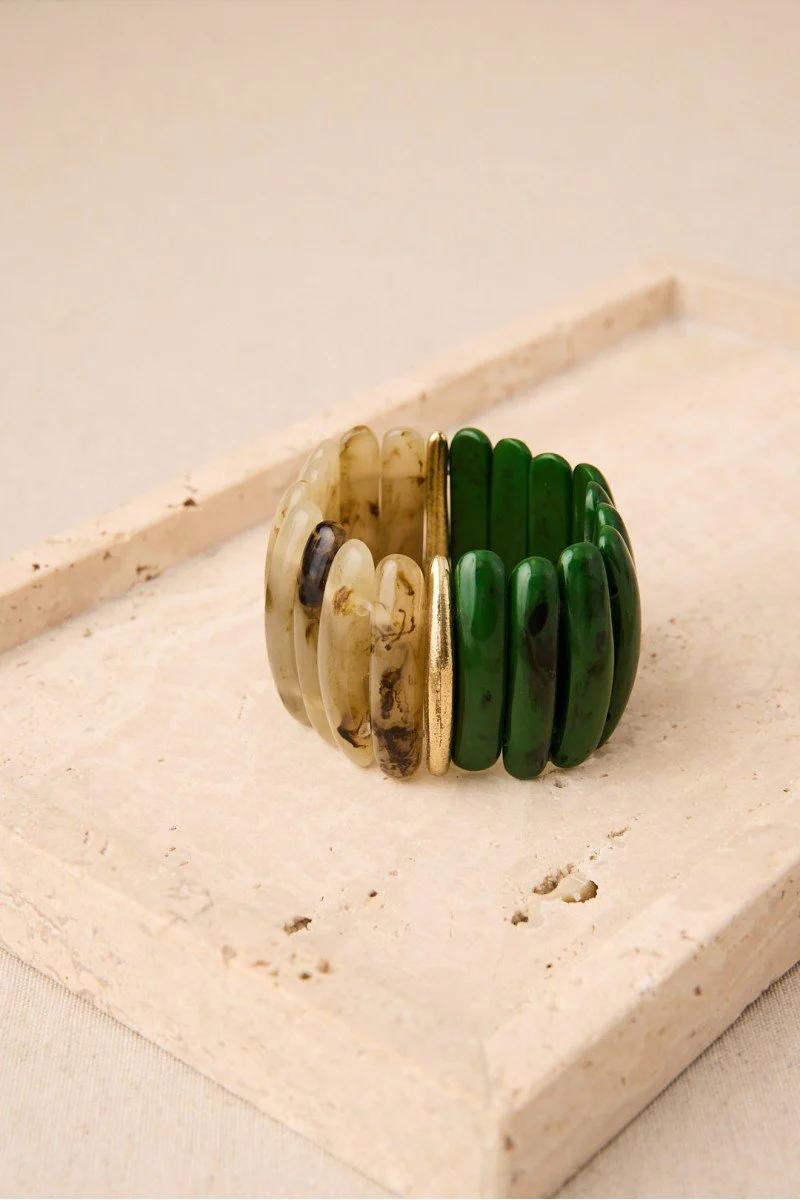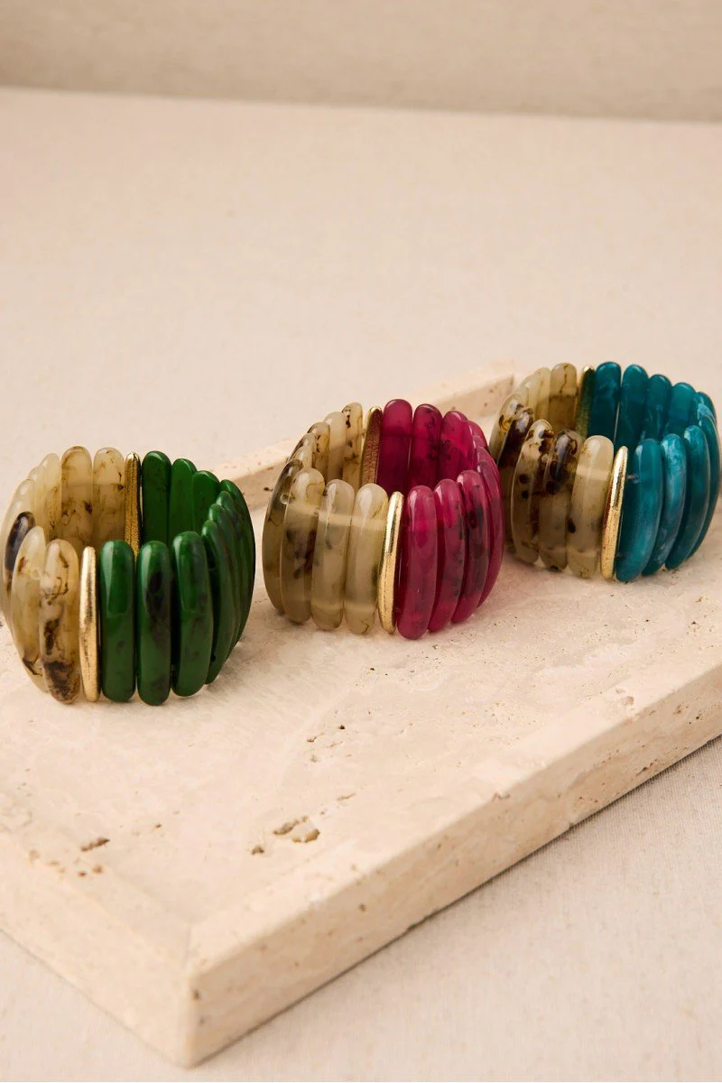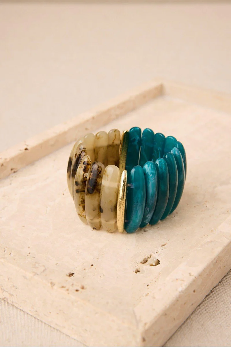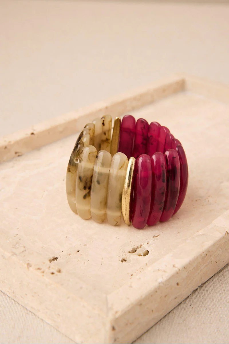Pulsera elástica de resina en acabado liso y brillante, combinando atractivo colores y con detalles de latón con baño de oro que aportan un toque elegante.