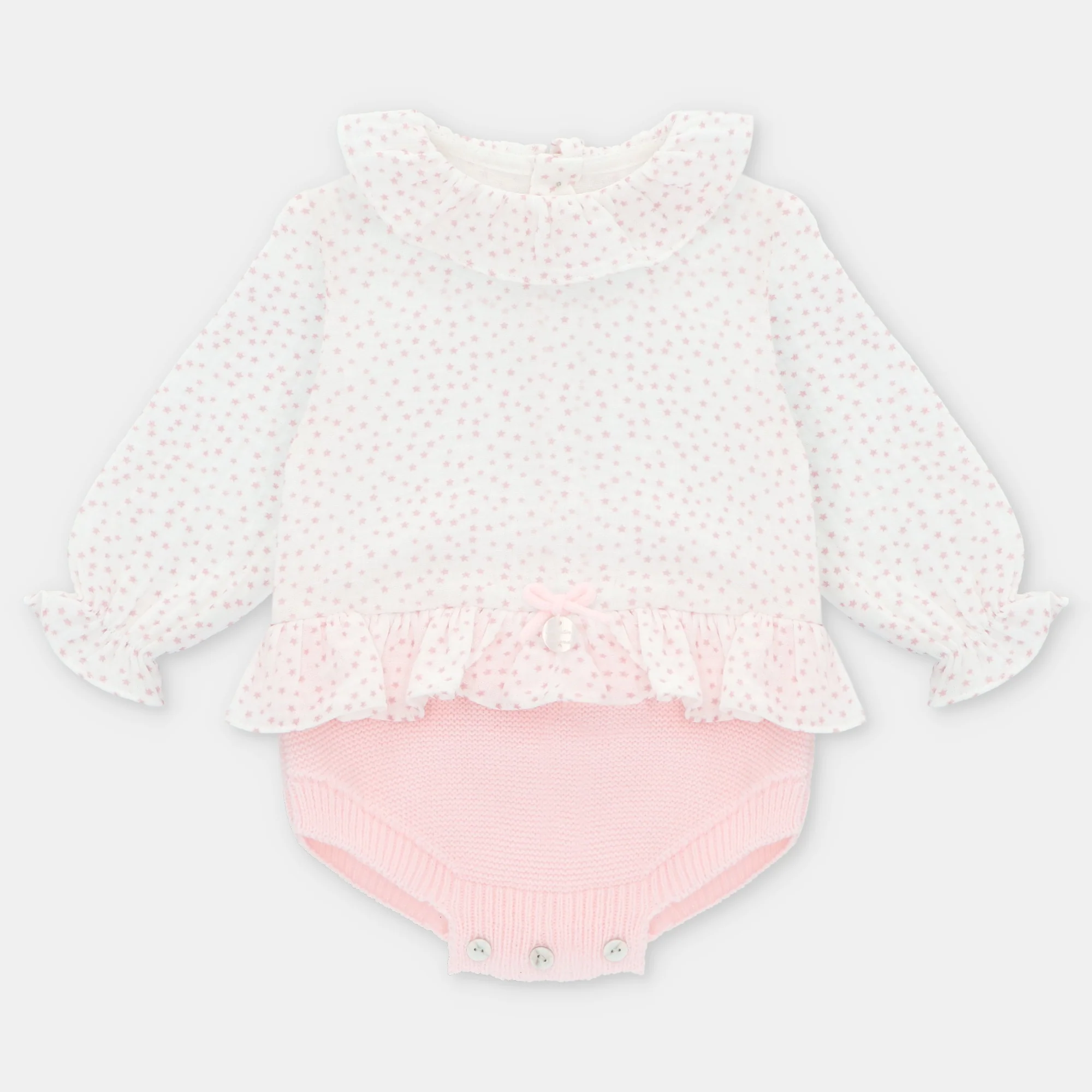 ¡Divina y tierna ranita rosa combinada con plumety! Una pieza combinada de tejido de punto con tela. Parte superior de tela con plumety, cuello redondo con olan, manga larga con elastico en puños, corte en la cintura con olan, parte inferior tejida, cierre de botones traseros y en la entrepierna para facilitar su puesta.