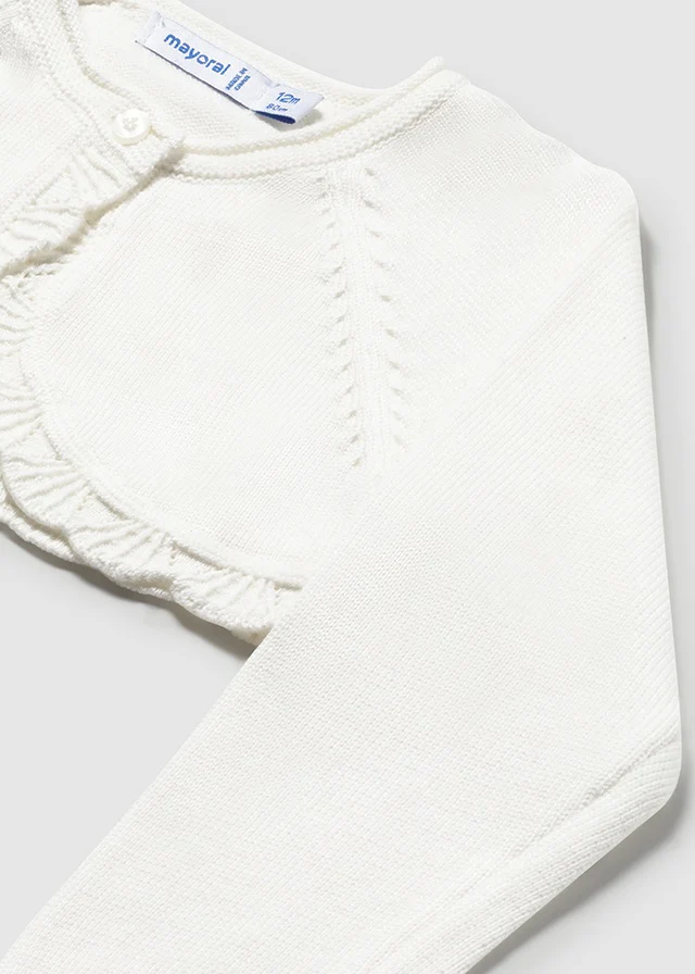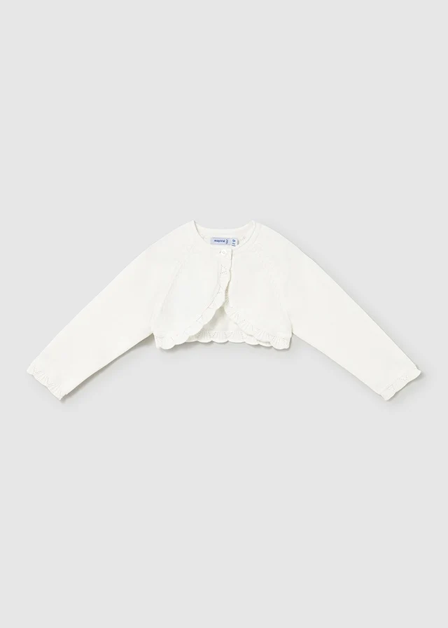 ¡Divino torerito con motivos calados unicos! De cuello redondo, manga larga, diseño corto de tipo bolero, cierre con botones en la parte delantera. Un «must-have» en el guardarropa de las niñas, ya que son prendas básicas y esenciales en su armario para completar cualquier look.