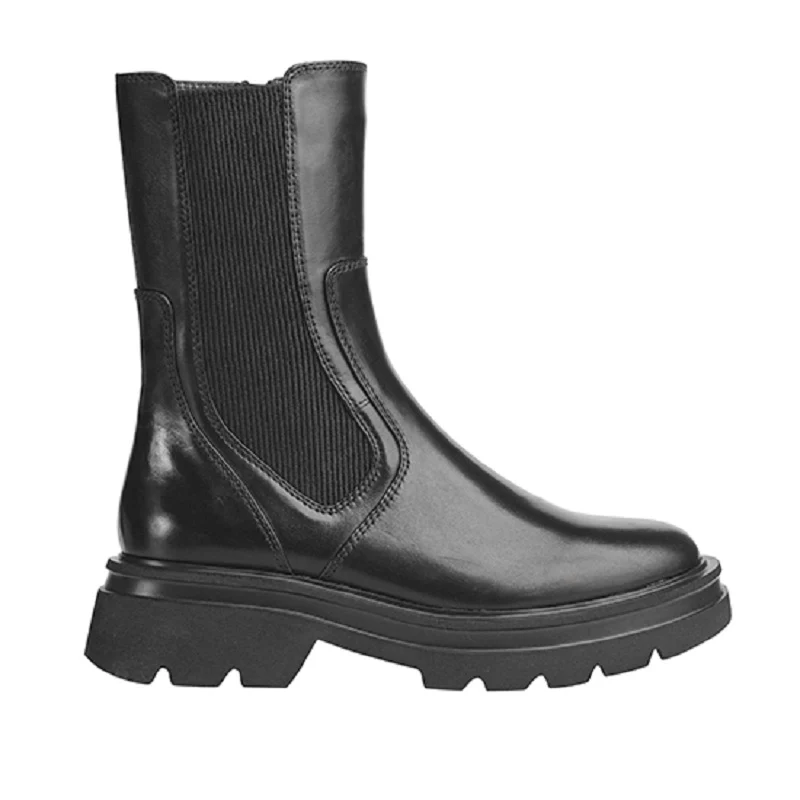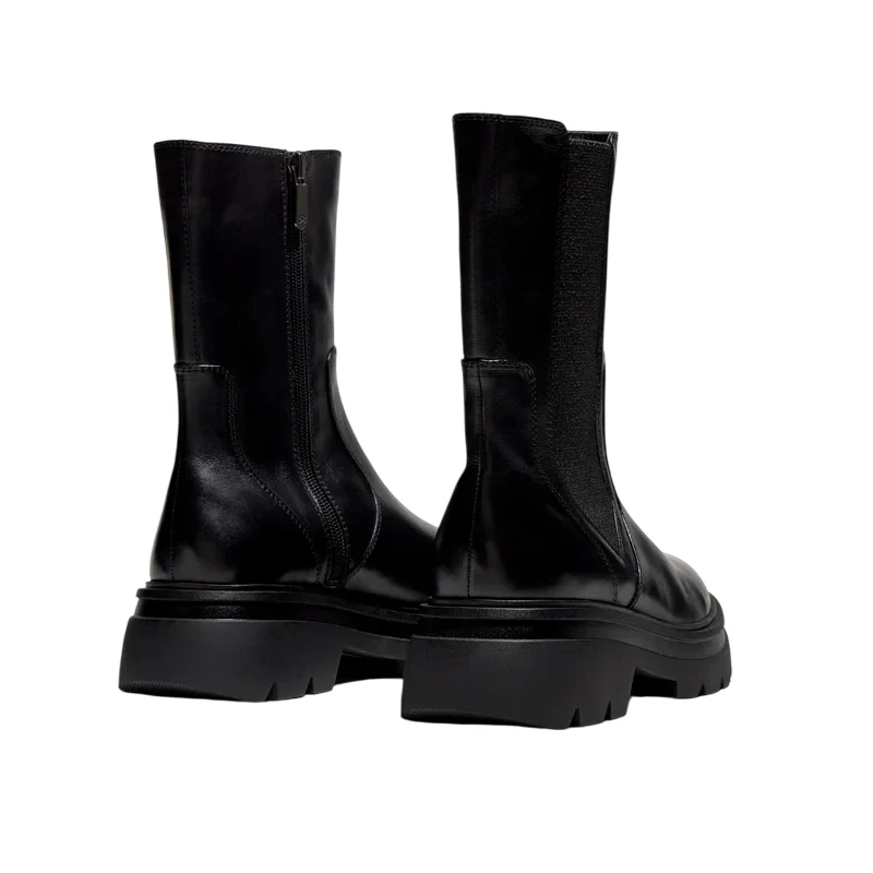 Una atrevida bota de media caña confeccionada en suave piel Delice negra. Con un amplio panel lateral elástico y una suela gruesa de goma con dibujo profundo, ofrece un toque moderno a la clásica silueta Chelsea. Diseñada para una comodidad duradera y un calce sin esfuerzo, esta bota ofrece un toque moderno y práctico a partes iguales. Una cremallera interior para mayor ajuste y comodidad. Resistente y refinada.