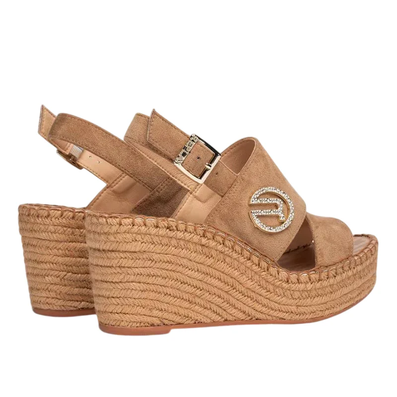 Sandalias de cuña de mujer en color beige. Suela se esparto, con doble tira delantera y tira trasera con hebilla y logo lateral metálico