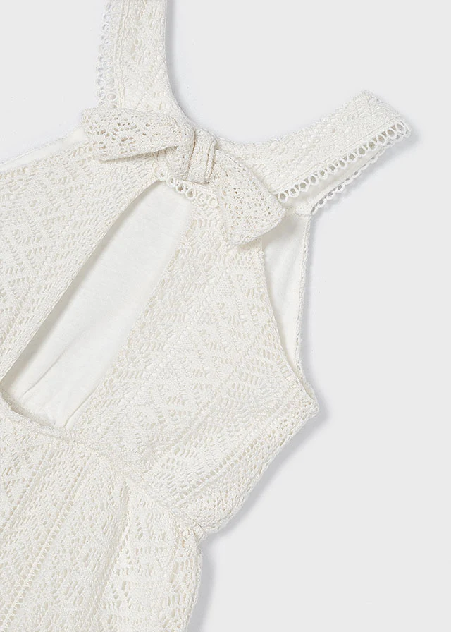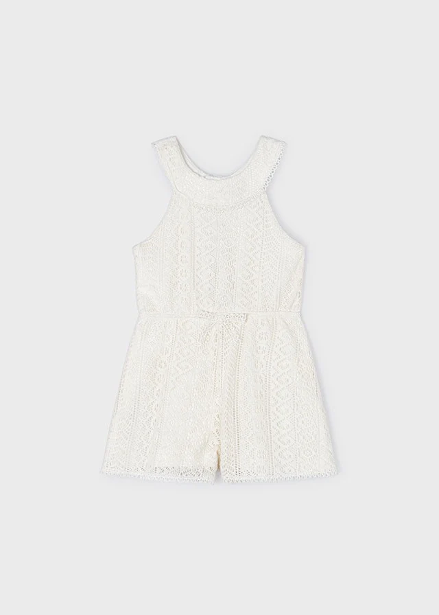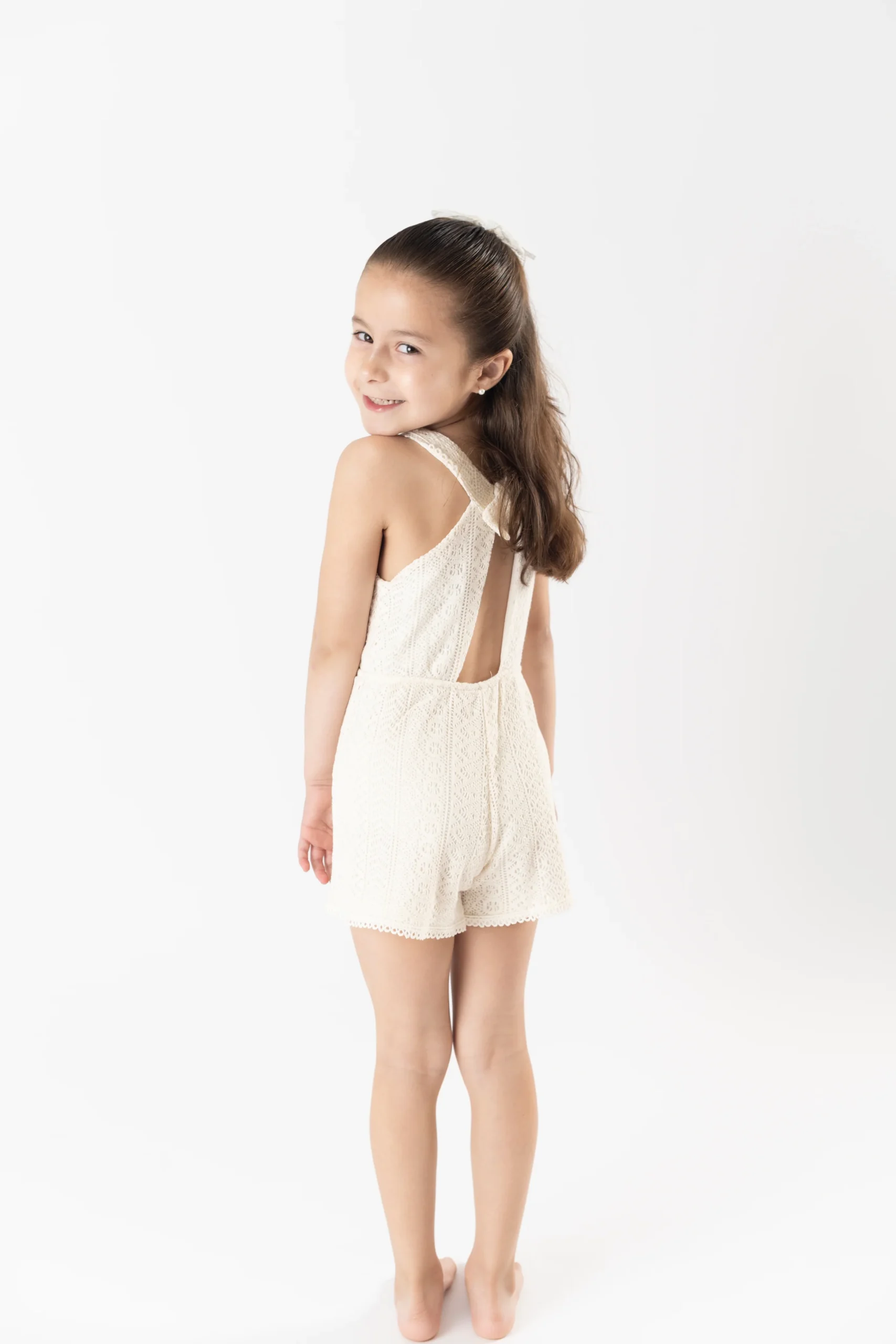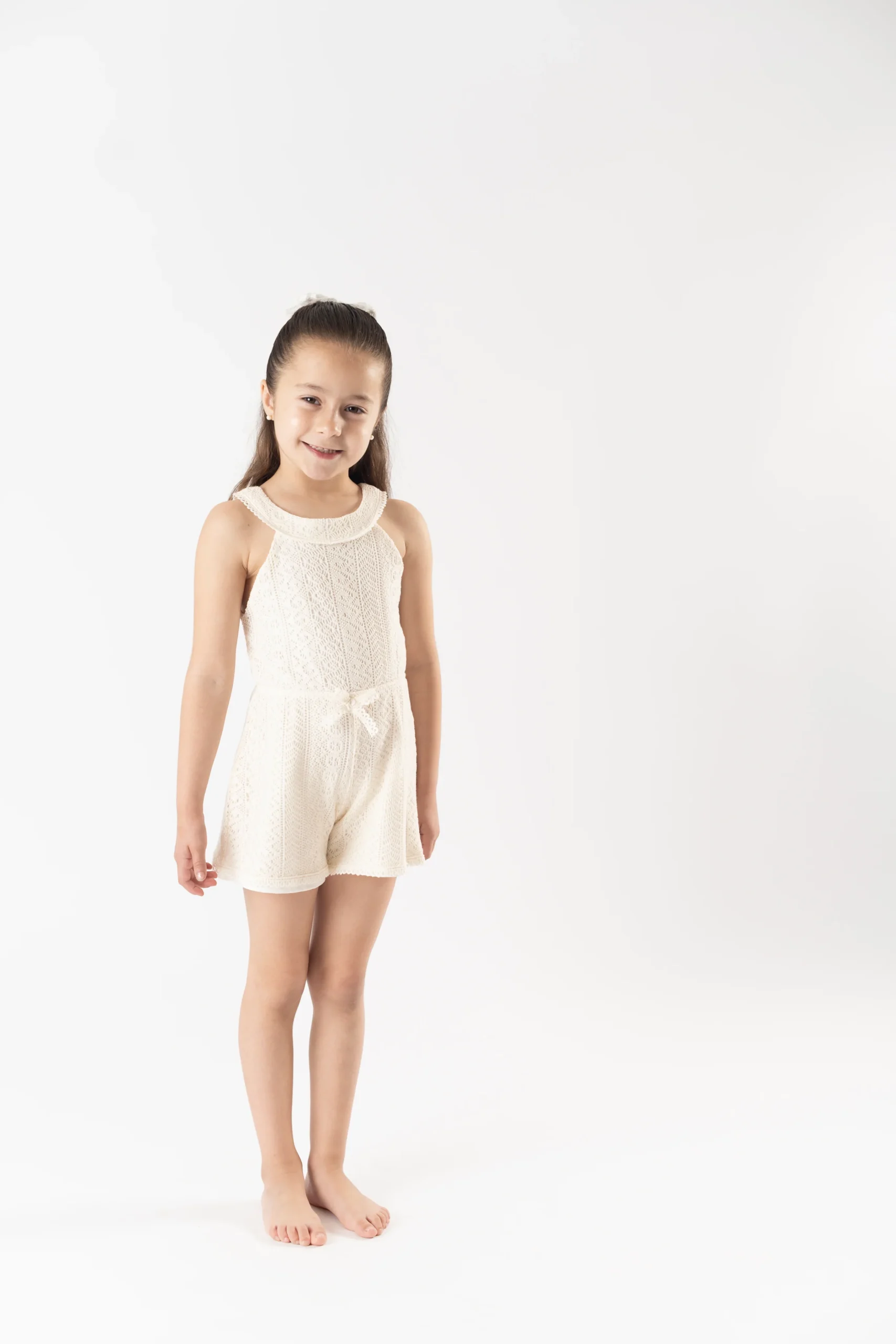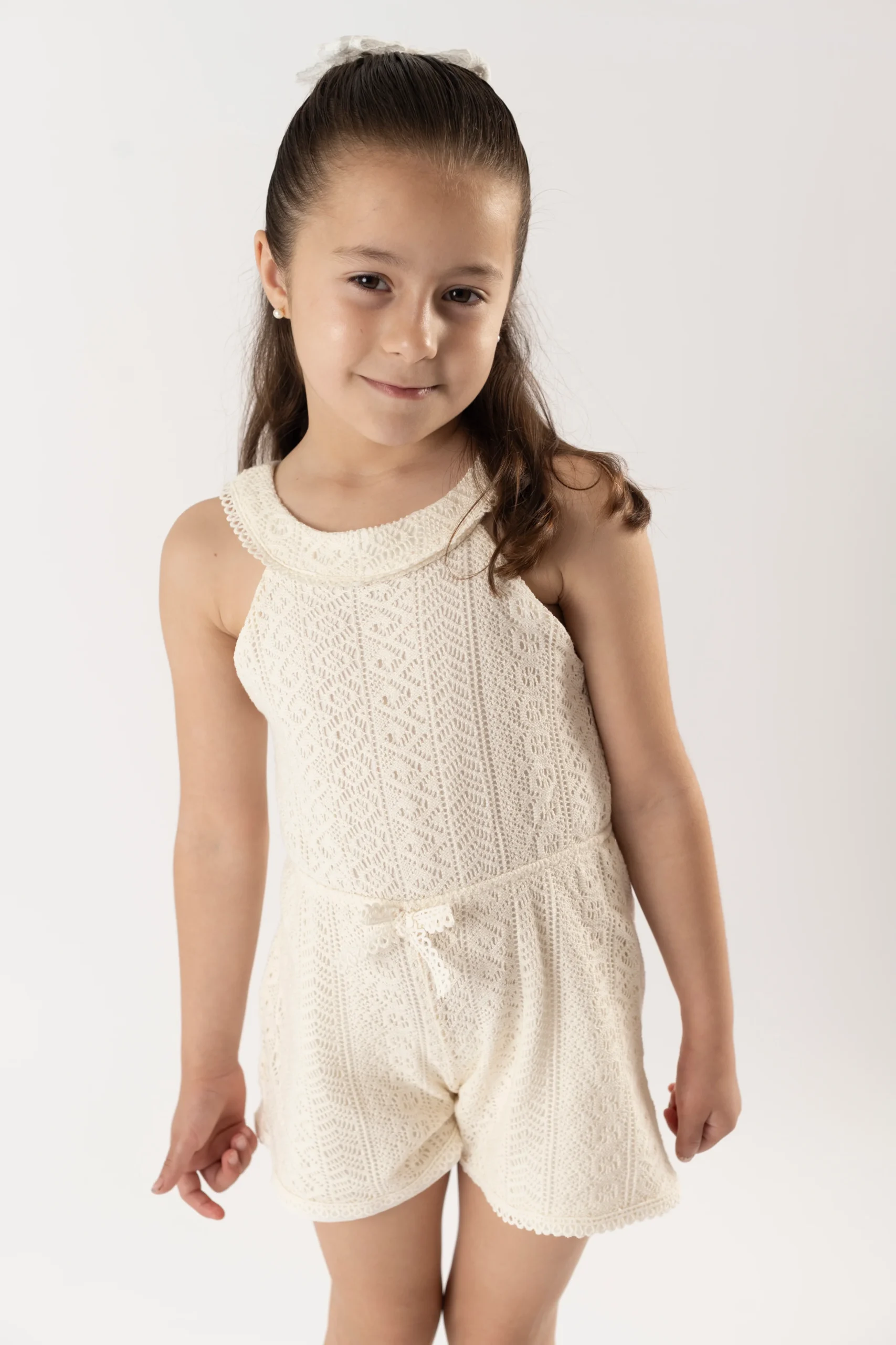 ¡Divino, elegante y fresco romper corto para disfrutar los dias de calor sin perder el estilo! ¡Una prenda basica para el guardarropa de las niñas, ya que es muy versatil pensada para cualquier ocasion! Romper de corte halter, cuello redondo, detalle de lazo por atras, abertura en la espalda, elastico en la cadera para acentuar la silueta de las niñas, corte en piernas corto. Tela de encaje de malla gruesa.
