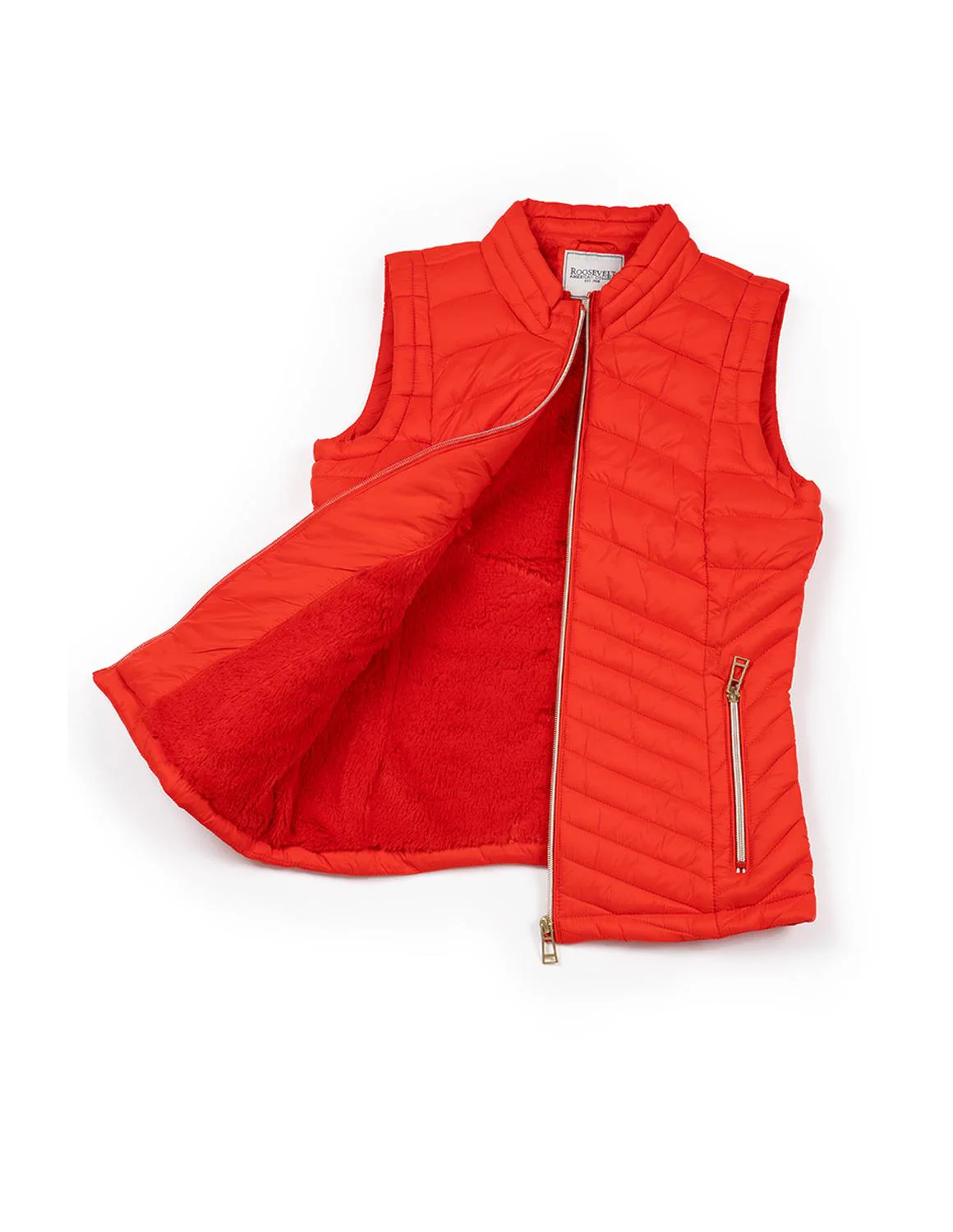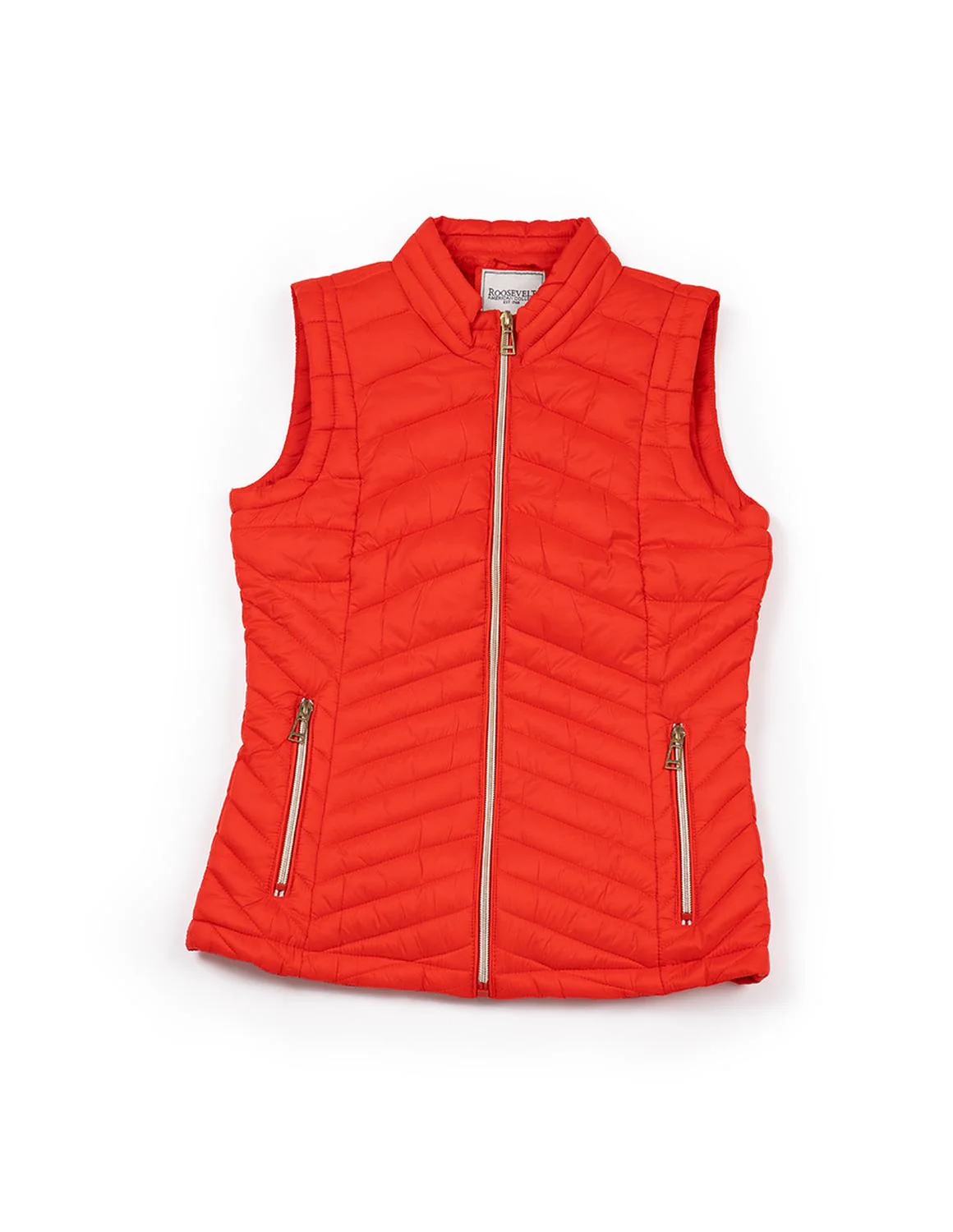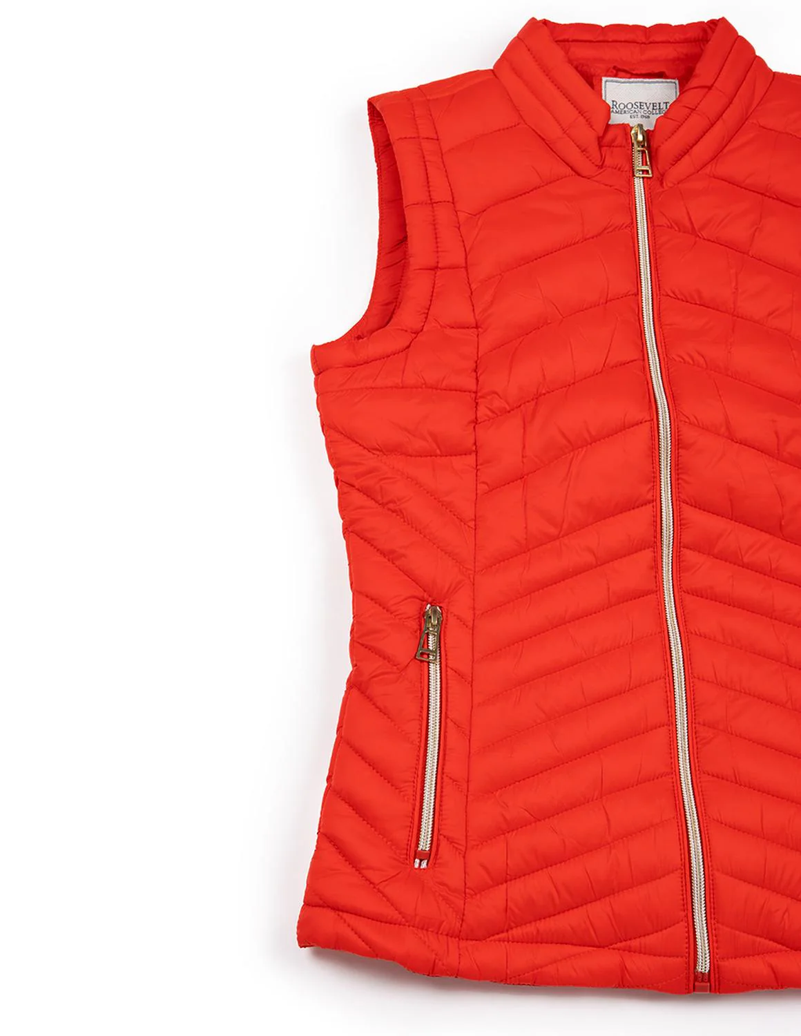 - Chaleco capitonado cuello alto, cierre frontal y en bolsillos tipo ojal, interior afelpado.