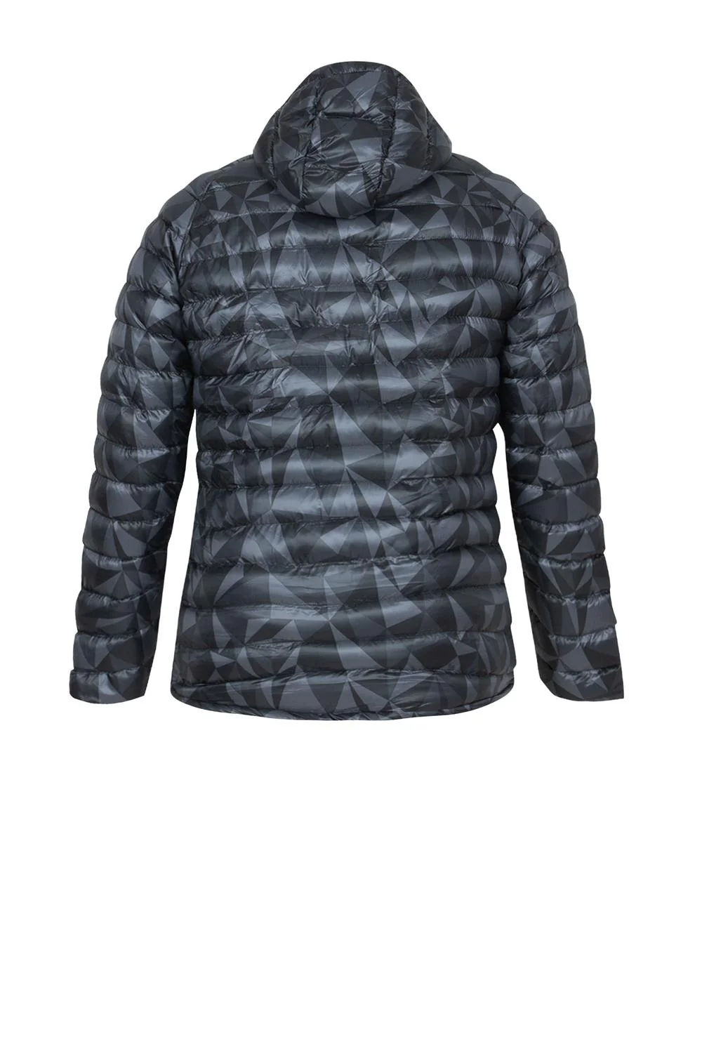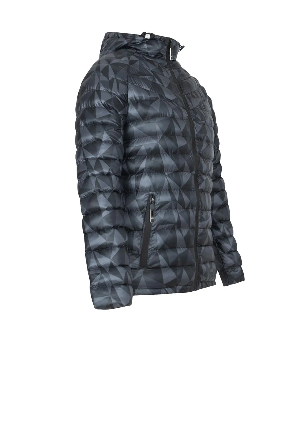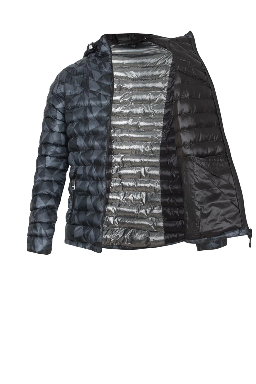 • Chamarra capitonada estampada, capucha con jaretas elásticas, cierres frontales y en bolsillos laterales.