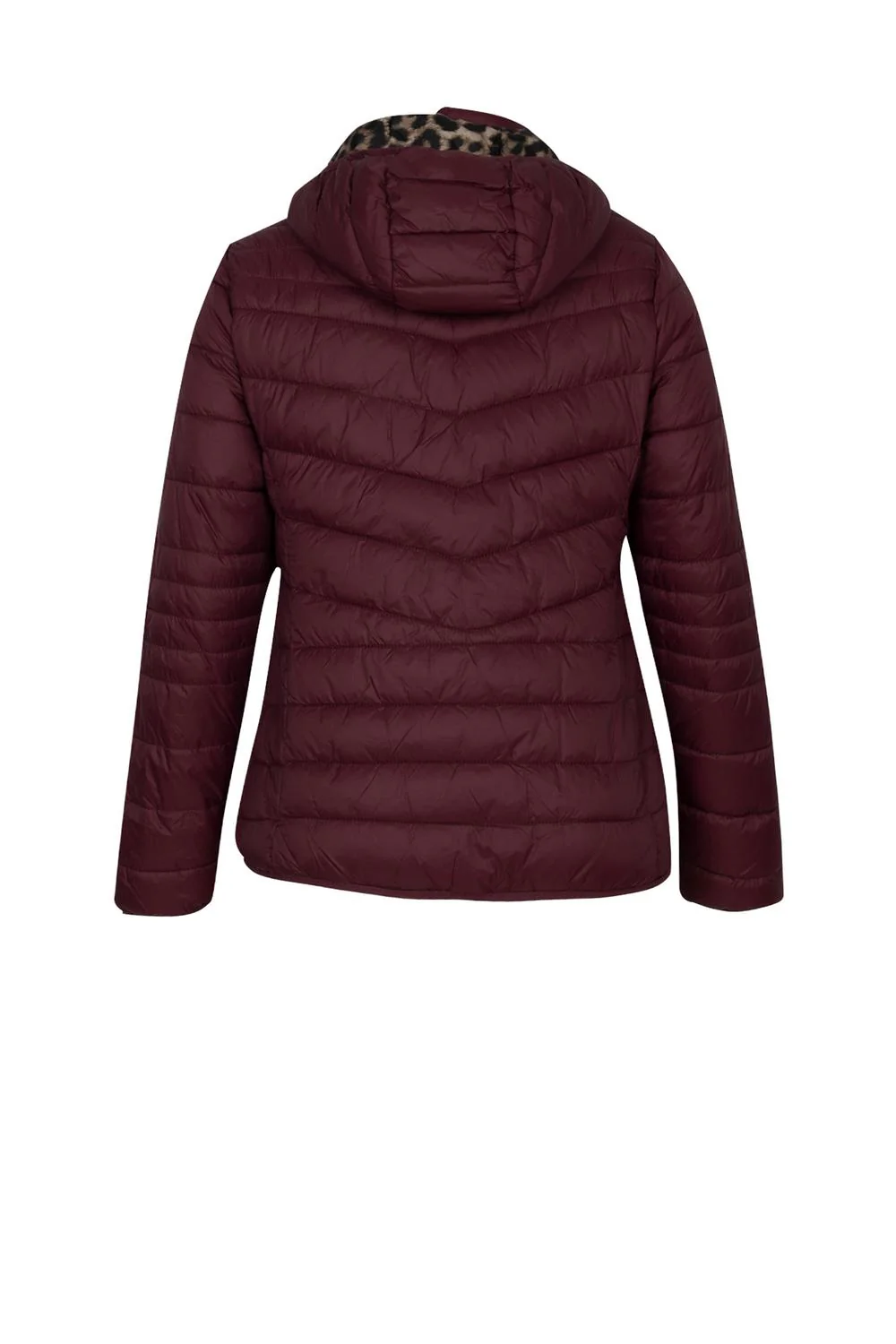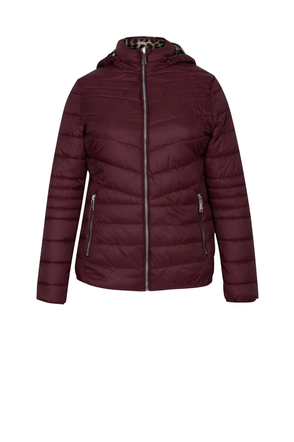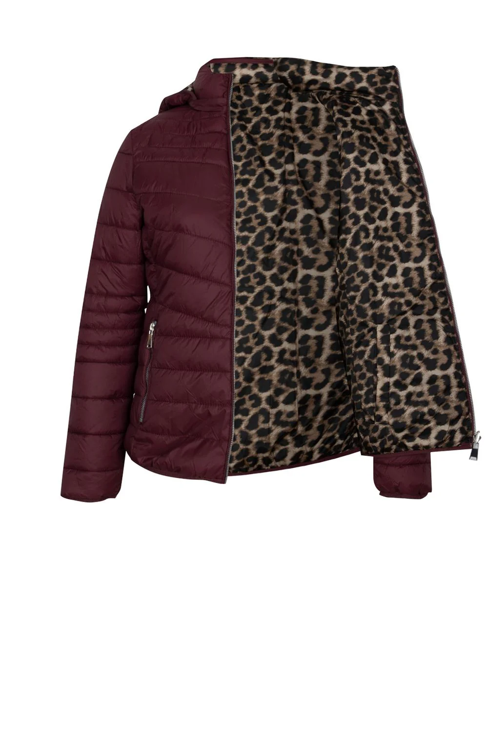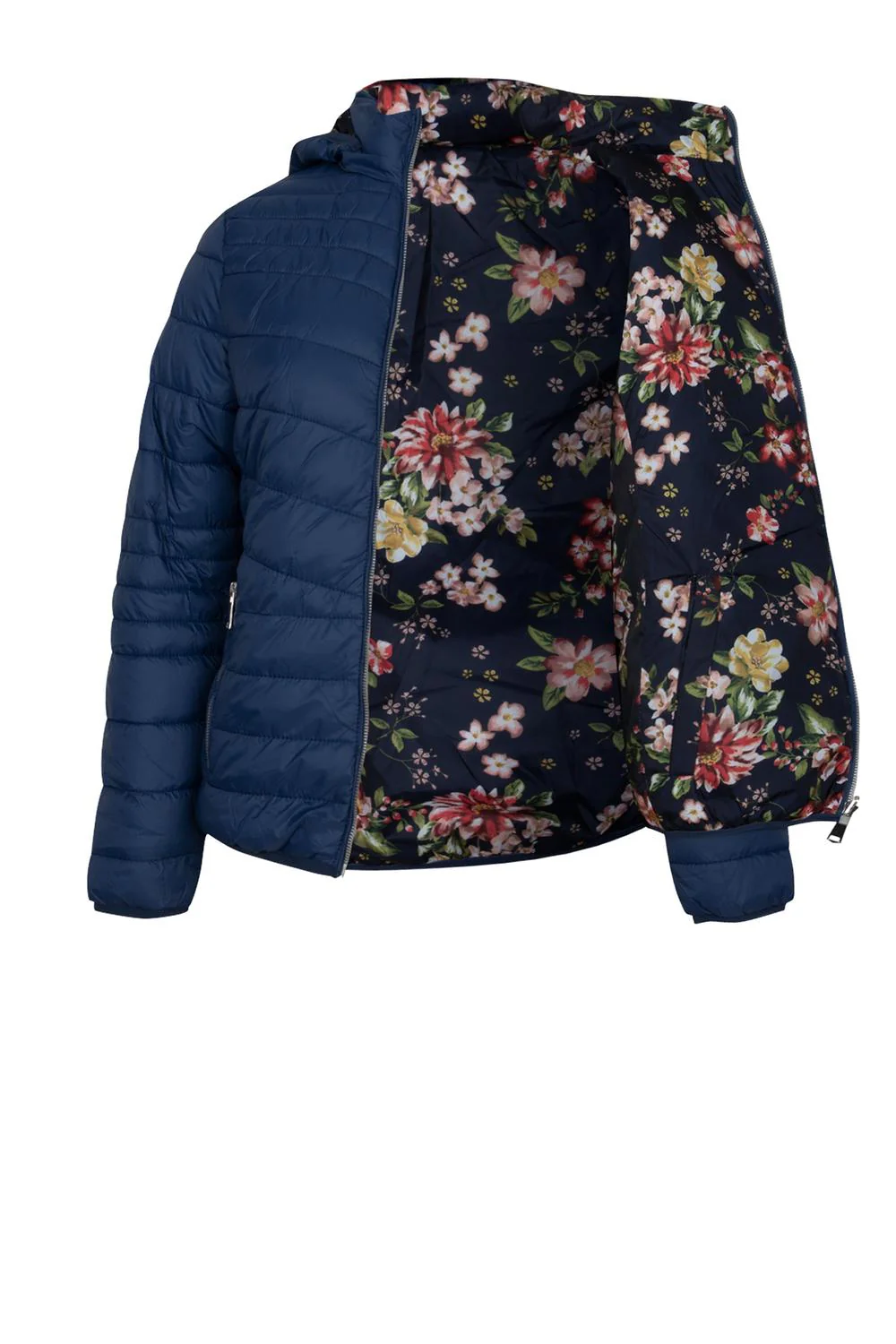 - Chamarra capitonada doble vista con interior estampado floral, capucha desmontable, cierre frontal y en bolsillos.