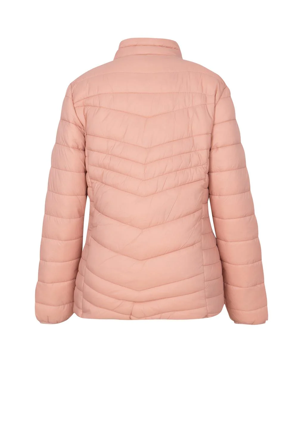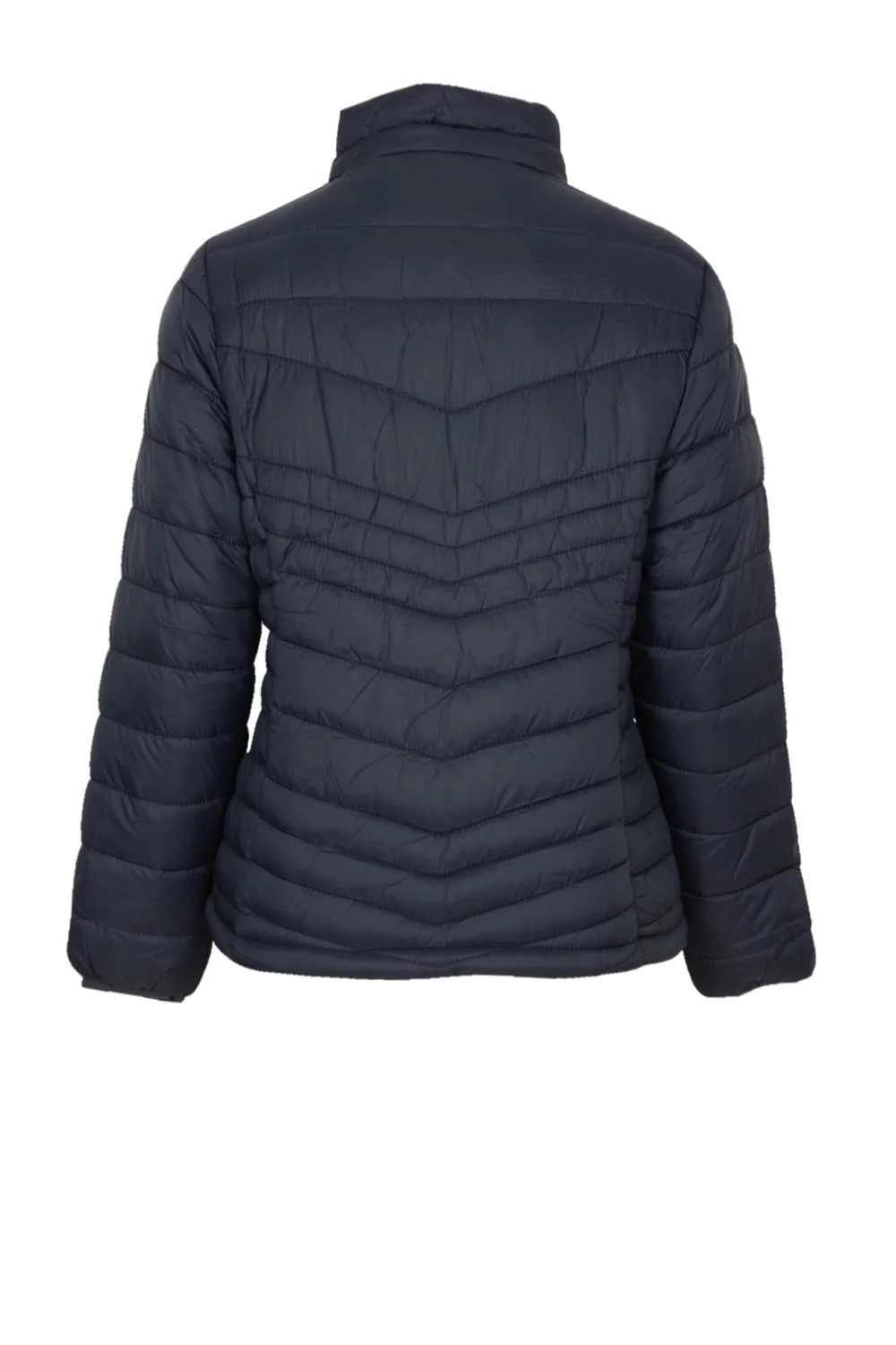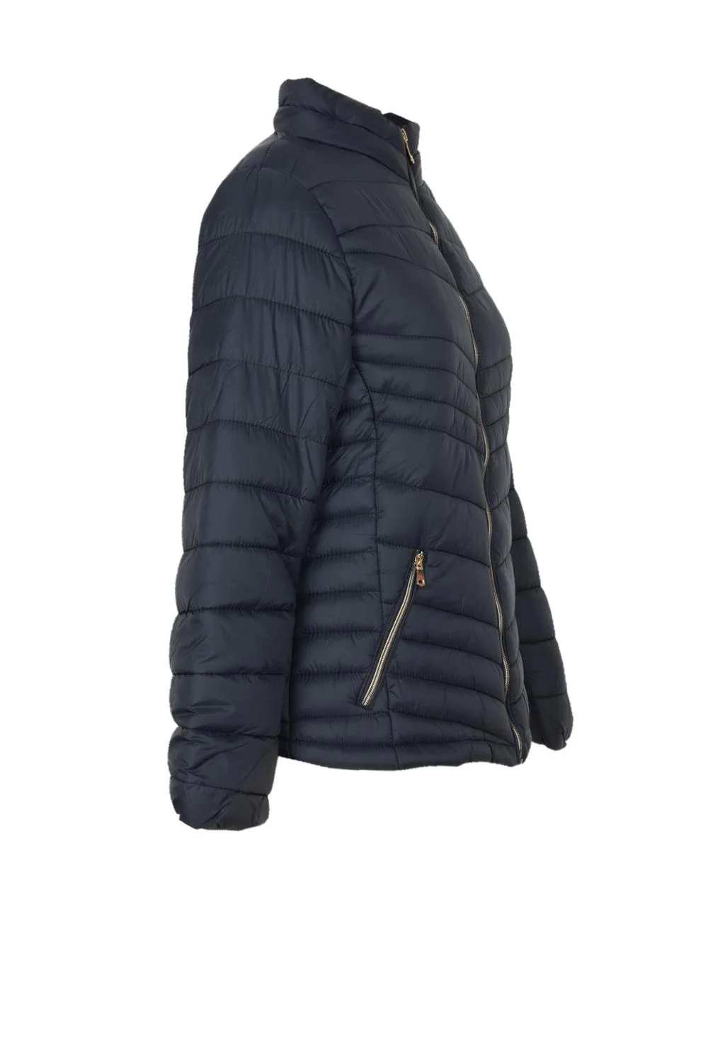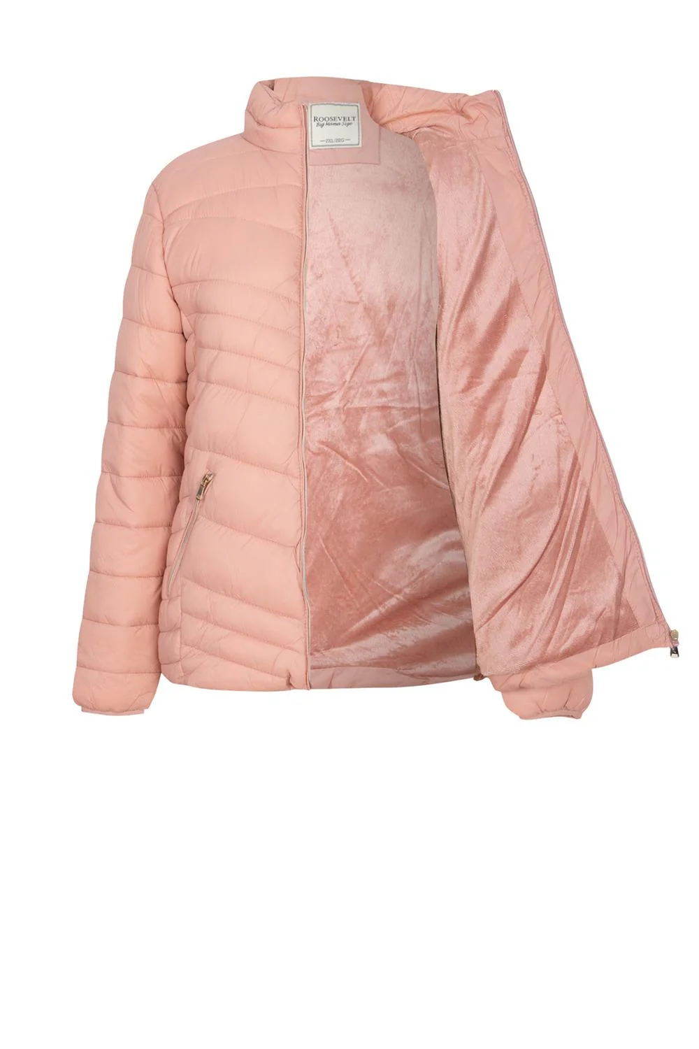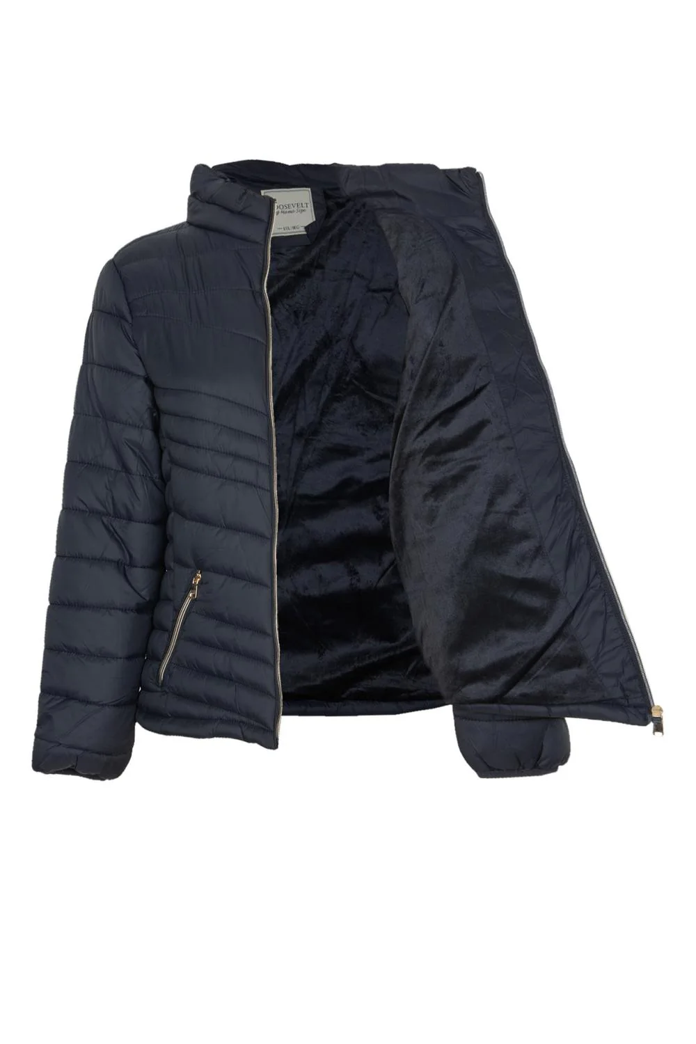 - Chamarra capitonada con cierres frontales, bolsillos laterales e interior afelpado.