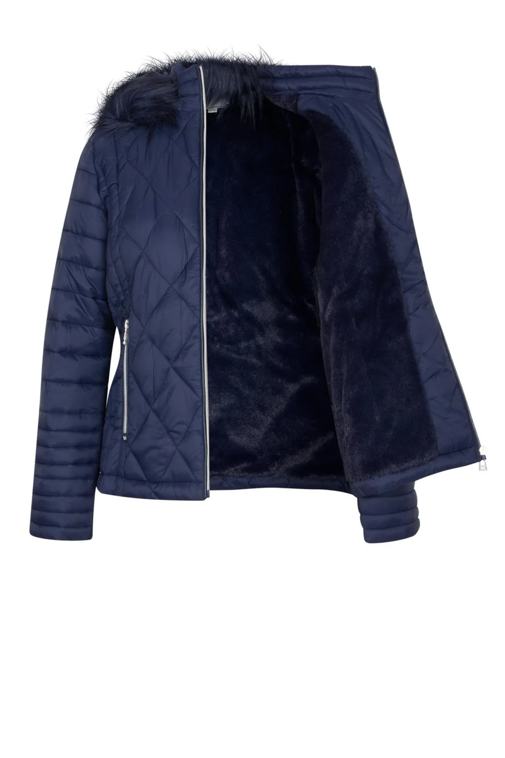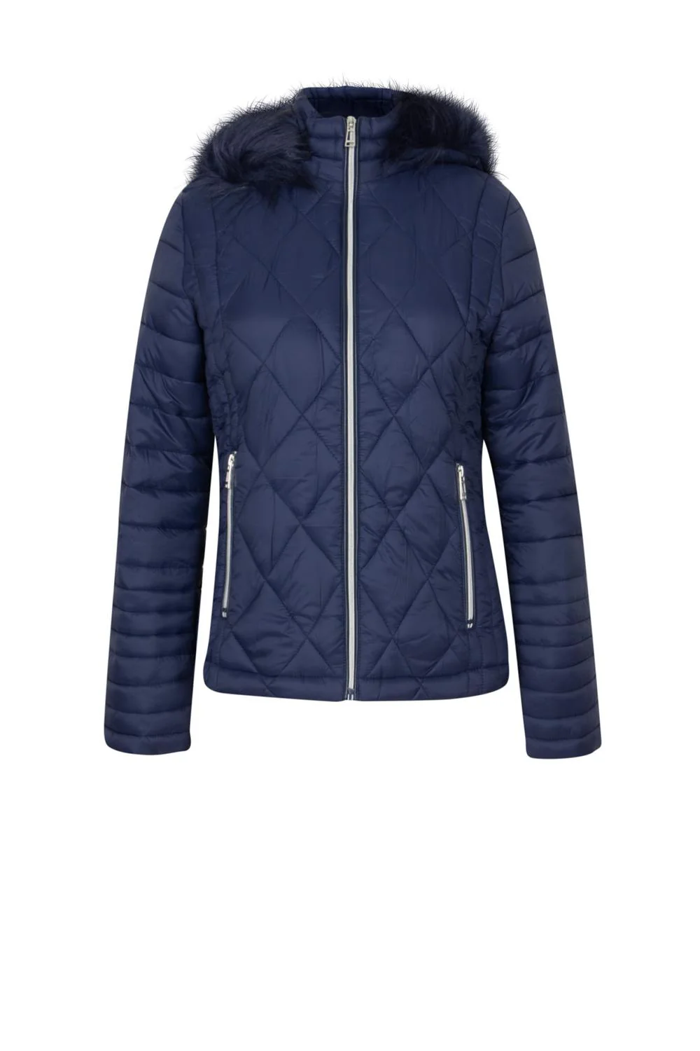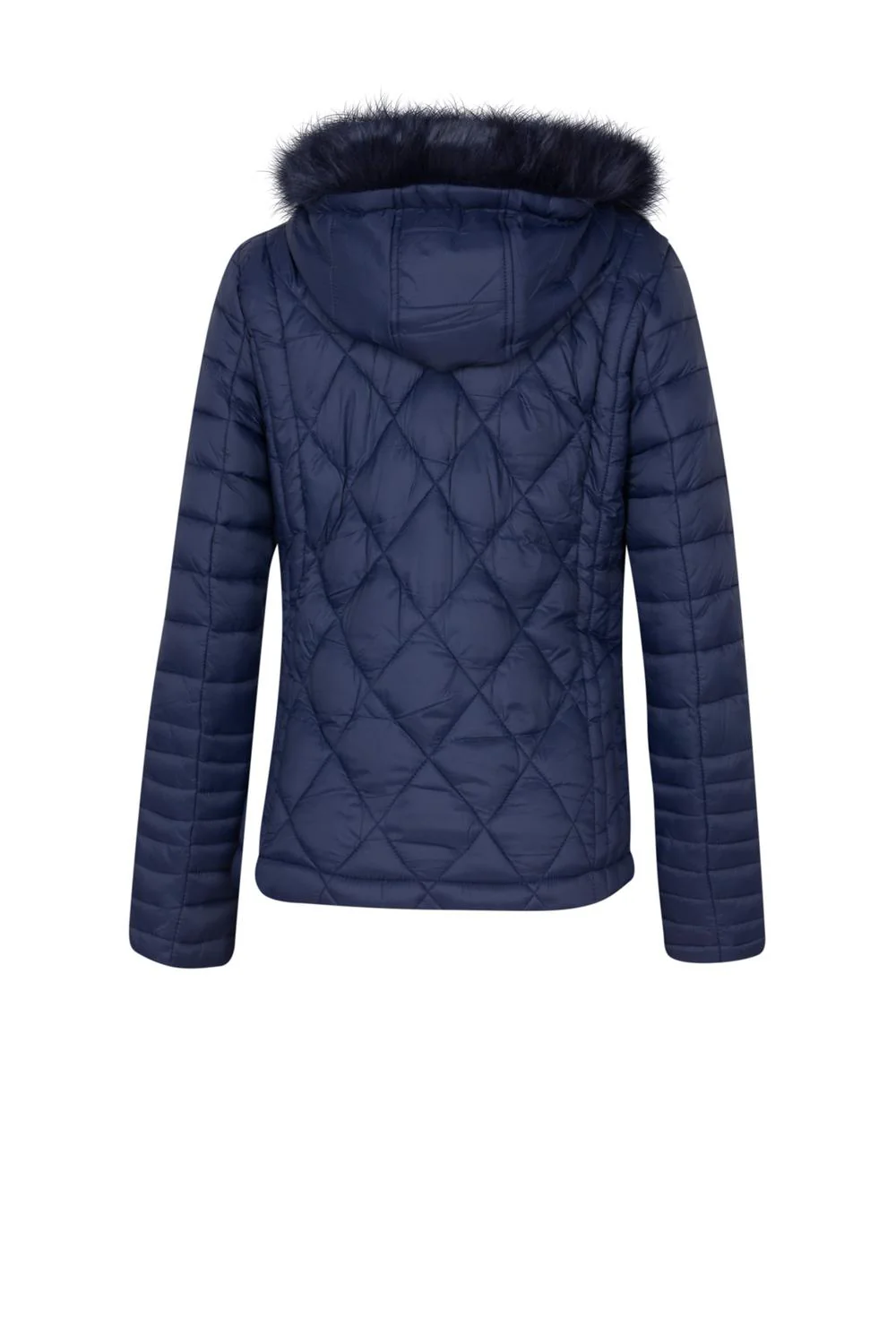 • Chamarra capitonada, capucha desmontable con pelo sintético, cierre frontal y en bolsillos e interior afelpado.
