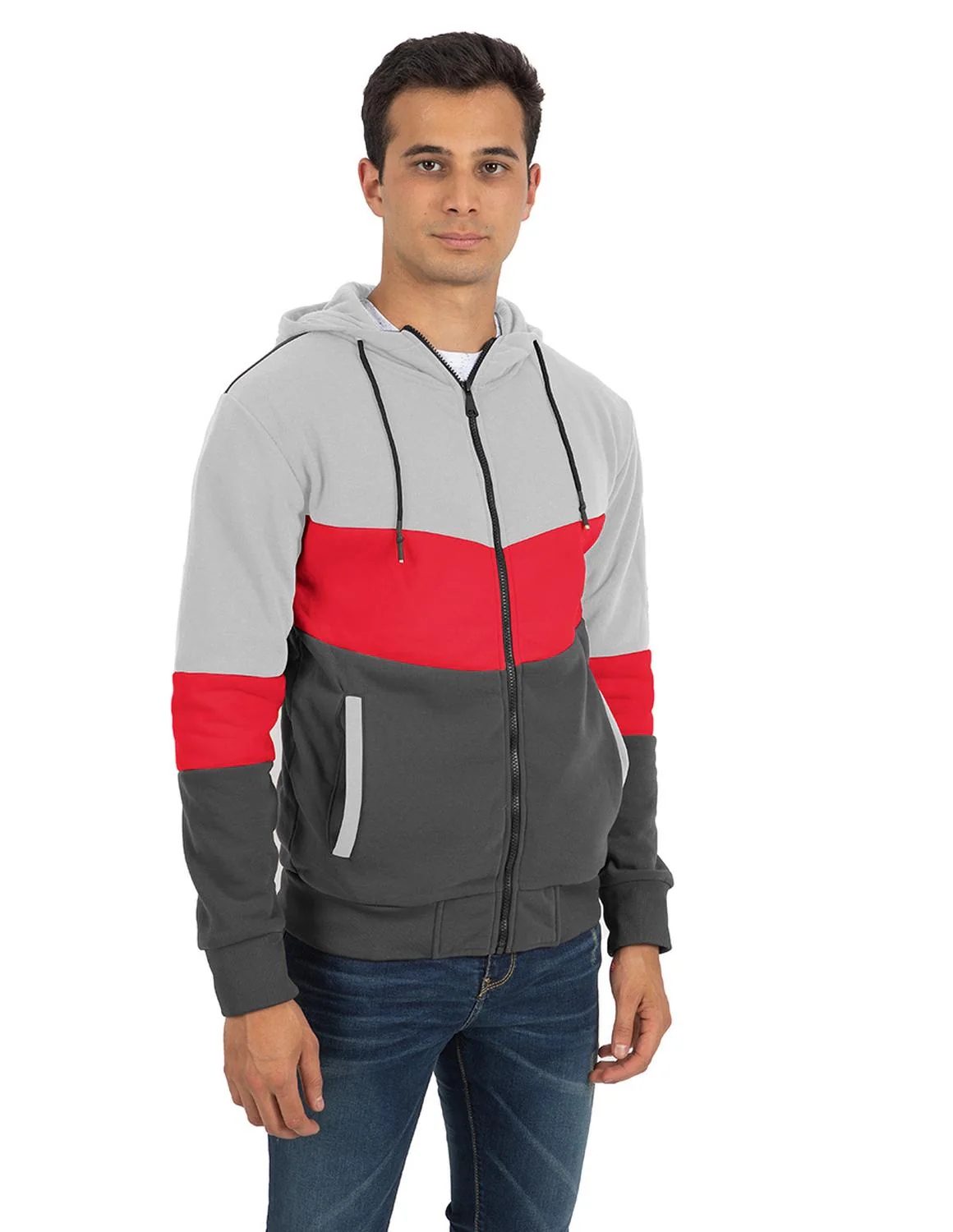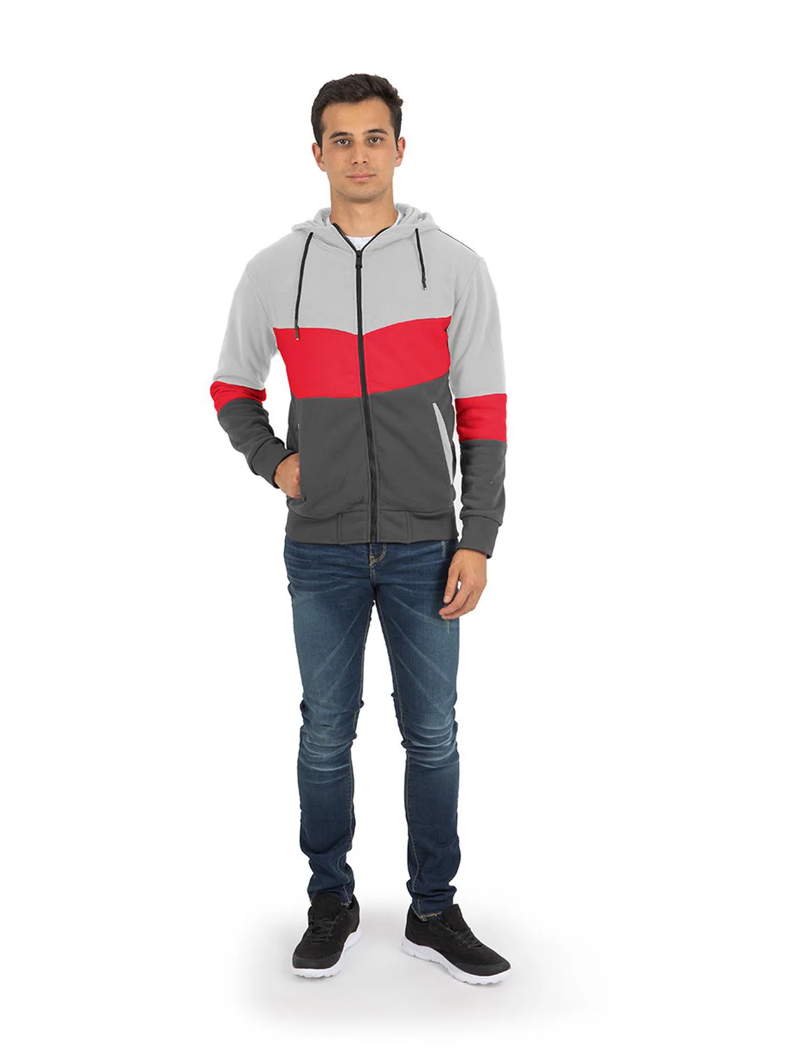 - Sudadera multicolor, capucha con jaretas ajustables, cortes decorativos, detalles en contraste de color y cierre frontal.